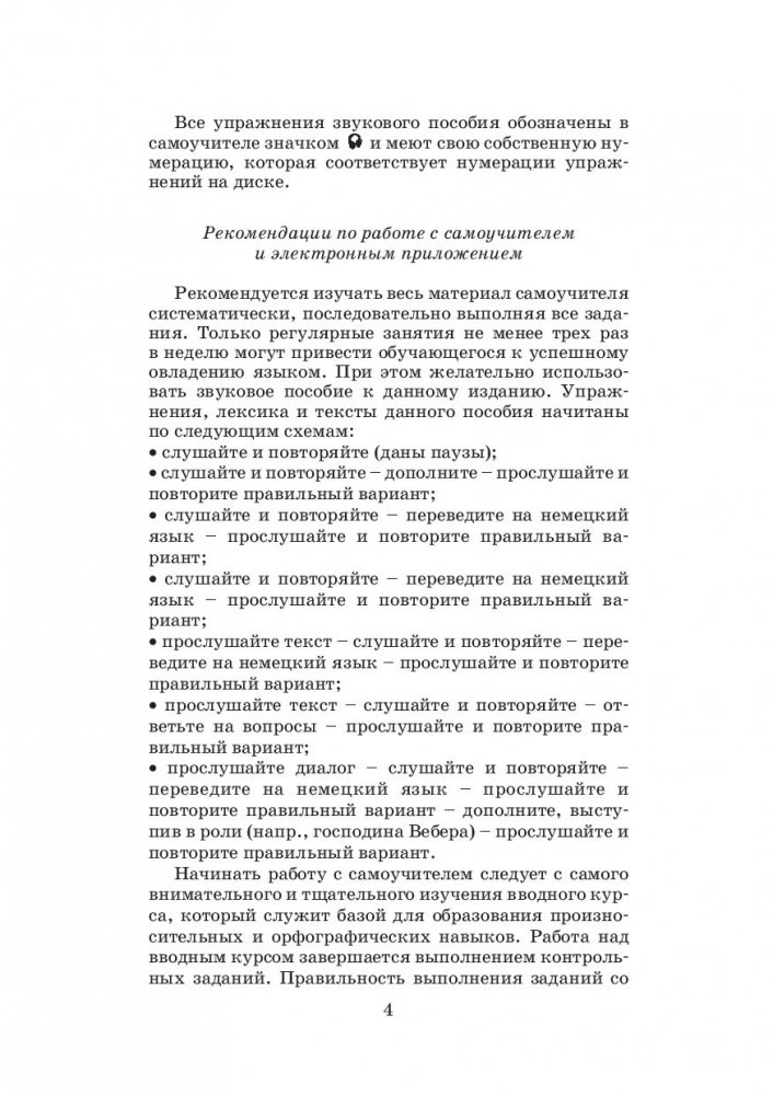 Цель самоучителя – научить вести беседу (задавать вопросы и понимать собеседника) в пределах тем повседневного общения. Состоит из вводного курса с указаниями по произношению; основного курса, охватывающего 12 тематических уроков; приводятся ключи к упражнениям. Приложение включает разговорные фразы, диалоги и тексты для чтения, краткий грамматический справочник, немецко-русский и русско-немецкий словари. Электронное приложение содержит звуковое пособие. Упражнения, диалогические и монологические тексты звукового пособия начитаны носителями языка. Для всех желающих изучать немецкий язык. Может использоваться на курсах иностранных языков, при подготовке к поступлению в вузы.