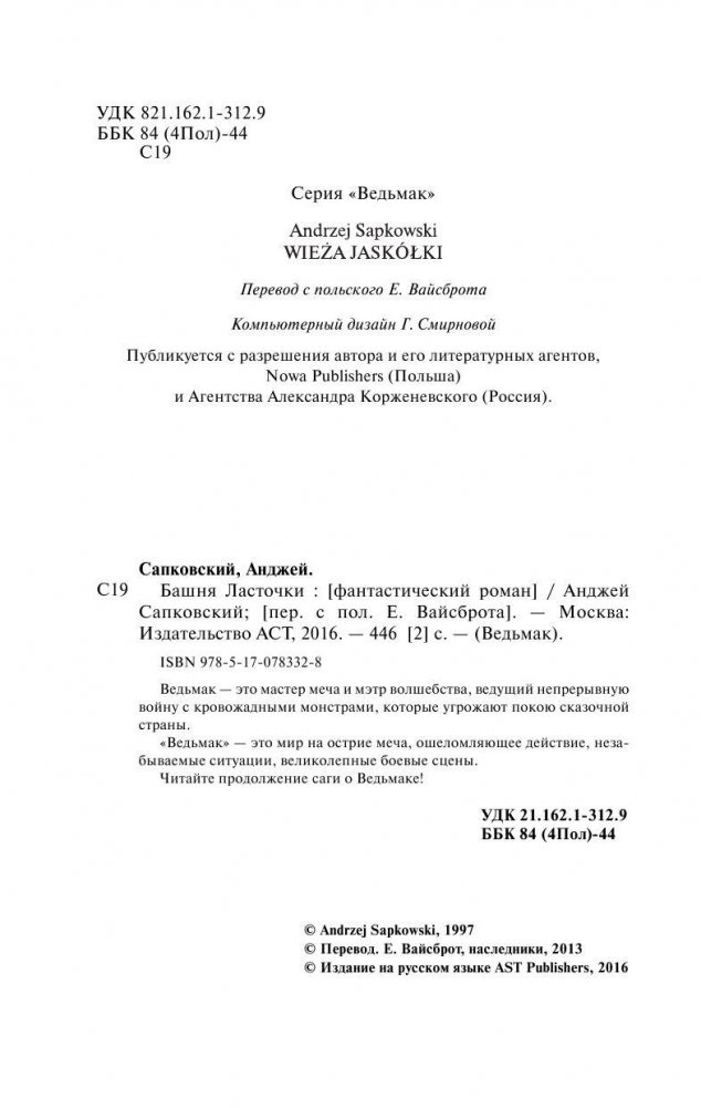 Анджей Сапковский - один из тех редких авторов, чьи произведения не просто обрели в нашей стране культовый статус, но стали частью российской фантастики. Более того, Сапковский - писатель, обладающий талантом творить Абсолютно оригинальные фэнтези, полностью свободные от влияния извне, однако связанные с классической мифологической традицией. Книги Сапковского не просто блистательны по литературности формы и глубине содержания. Они являют собою картину мира - мира "меча и магии", мира искрометного юмора, не только захватывающего внимание читателя, но и трогающего его душу. Читайте сагу о Цири и Геральте!