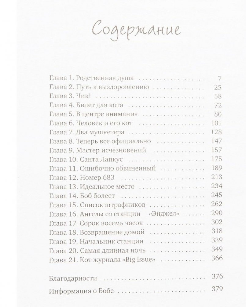 В этой истории два главных героя - Джеймс Боуэн, уличный лондонский музыкант, и рыжий Боб, уличный лондонский кот. Они были бездомными и одинокими, но однажды повстречали друг друга... Джеймс погибал от наркотиков и отчаяния, в его жизни не было никакого смысла, пока в ней не появился четвероногий друг, который помог ему справиться с проблемами, принес удачу и стал настоящим ангелом-хранителем. Теперь Боба и Джеймса (именно в такой последовательности!) прекрасно знают не только жители Лондона, которые встречают их на улицах, в метро и кафе, но и сотни тысяч людей во всем мире. Ролики на Youtube, фотографии на фейсбуке, записи в твиттер, а теперь и книга, написанная Джеймсом Боуэном, рассказывают удивительную историю о дружбе с котом, который изменил его жизнь.