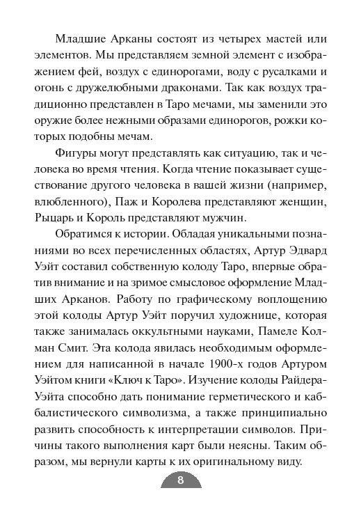 А в инструкции для каждой из 78 карт вы найдете простые указания и толкования, которые позволят вам делать и легко интерпретировать предсказания не только для себя, но и для своих близких.