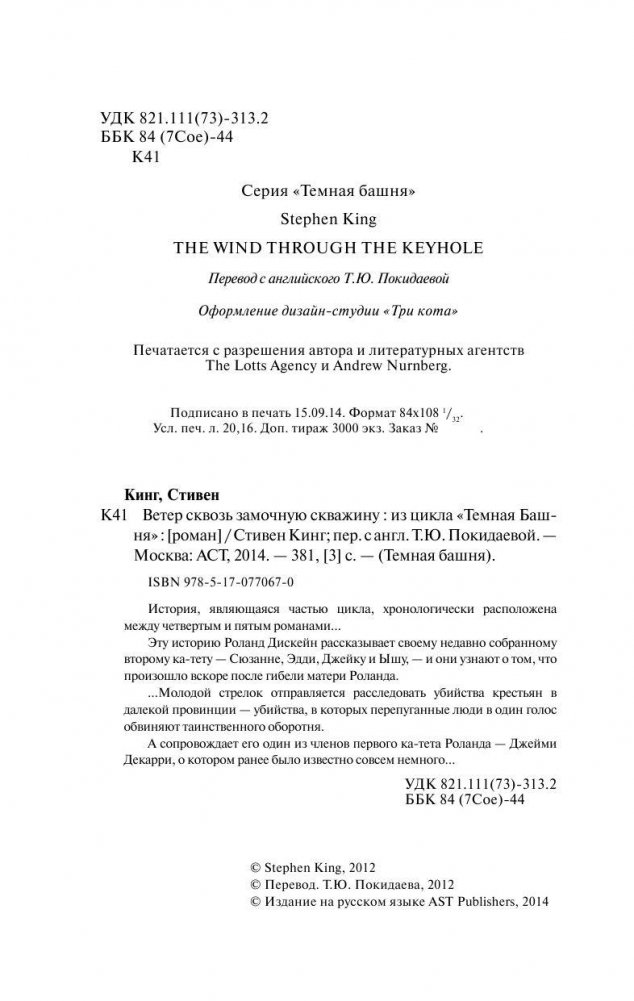 Миллионы фанатов цикла "Темная башня" вопреки словам Стивена Кинга о том, что легендарная сага закончена, ждали ее продолжения. И не напрасно! История, являющаяся частью цикла, хронологически расположена между четвертым и пятым романами... Эту историю Роланд Дискейн рассказывает своему недавно собранному второму ка-тету - Сюзанне, Эдди, Джейку - и они узнают о том, что произошло вскоре после гибели матери Роланда. Молодой стрелок отправляется расследовать убийства крестьян в далекой провинции - убийства, в которых перепуганные люди в один голос обвиняют таинственного оборотня. А сопровождает его один из членов первого ка-тета Роланда - Джейми Декарри, о котором ранее было известно совсем немного...
