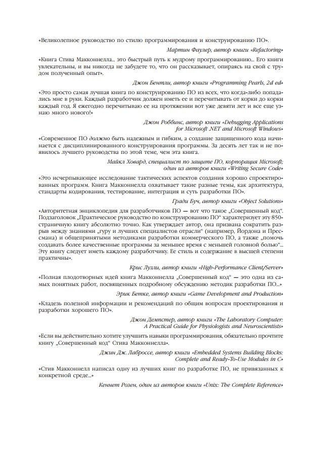 Более 10 лет первое издание этой книги считалось одним из лучших практических руководств по программированию. Сейчас эта книга полностью обновлена с учетом современных тенденций и технологий и дополнена сотнями новых примеров, иллюстрирующих искусство и науку программирования. Опираясь на академические исследования, с одной стороны, и практический опыт коммерческих разработок ПО — с другой, автор синтезировал из самых эффективных методик и наиболее эффективных принципов ясное прагматичное руководство. Каков бы ни был ваш профессиональный уровень, с какими бы средствами разработками вы ни работали, какова бы ни была сложность вашего проекта, в этой книге вы найдете нужную информацию, она заставит вас размышлять и поможет создать совершенный код.