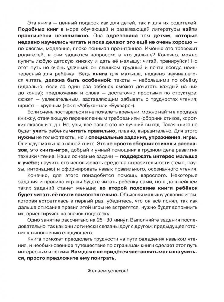 Ваш малыш только что перевернул последнюю страницу «Азбуки»? Поздравляем! Первые шаги сделаны. Теперь предстоит длинный путь: нужно научиться читать правильно, быстро и выразительно, хорошо понимая прочитанное. Оказывается, это можно делать с удовольствием, просто играя. Специально составленные упражнения и интересные тексты, огромное количество увлекательных игр и прекрасные иллюстрации ждут вас на страницах книги «Читаем после «Азбуки». Они окажут неоценимую помощь маленьким непоседам. Искренне верим, что эта книга-игра, книга-путешествие станет вашему малышу лучшим другом и скоро он порадует вас умением правильно и быстро читать. Счастливого пути!