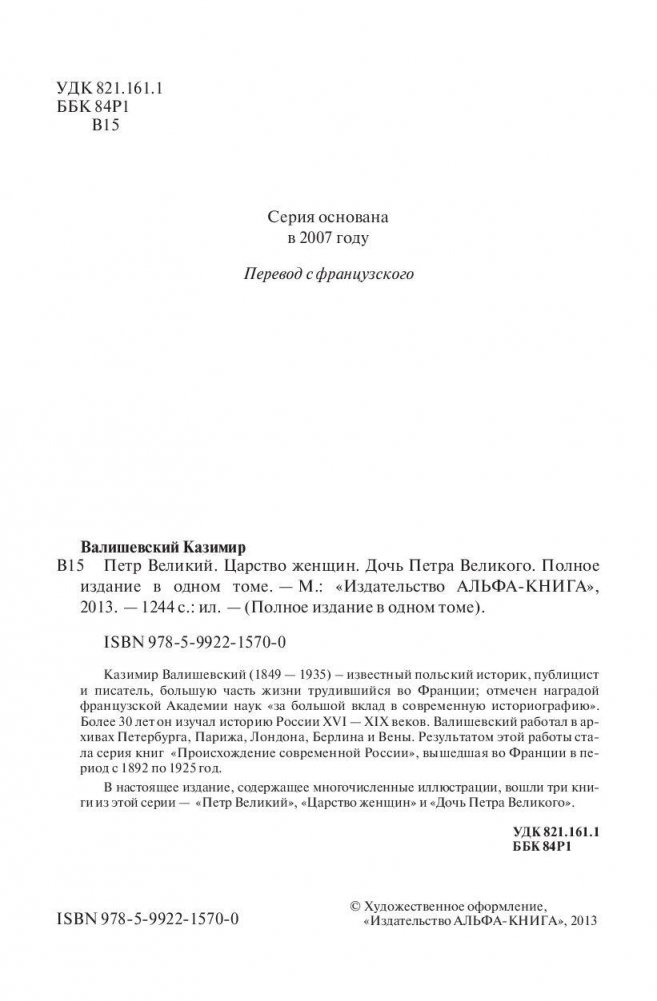 Казимир Валишевский (1849 — 1935) — известный польский историк, публицист и писатель, большую часть жизни трудившийся во Франции; отмечен наградой французской Академии наук «за большой вклад в современную историографию». Более 30 лет он изучал историю России XVI — XIX веков. Валишевский работал в архивах Петербурга, Парижа, Лондона, Берлина и Вены. Результатом этой работы стала серия книг «Происхождение современной России», вышедшая во Франции в период с 1892 по 1925 год. В настоящее издание, содержащее многочисленные иллюстрации, вошли три книги из этой серии — «Петр Великий», «Царство женщин» и «Дочь Петра Великого».