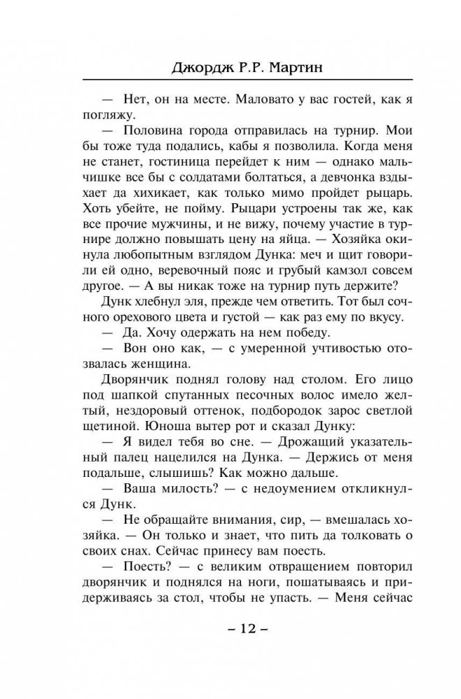 Ещё сто лет – до смертоносного противостояния Старков, Баратеонов и Ланнистеров. Ещё правит Вестеросом династия Таргариенов от крови драконов. Ещё свежа память о битве за Железный трон Дейемона и Дейерона Таргариенов, ещё стоят у городских стен эшафоты, на которых окончили жизнь проигравшие. А по вестеросским землям странствует молодой рыцарь Дункан со своим оруженосцем – десятилетним Эгом, – он жаждет славы, чести и приключений, и он получит их. И не только на ристалищах чести, но и в череде жестоких заговоров и опасных политических интриг, по-прежнему зреющих за замковыми стенами Семи Королевств…