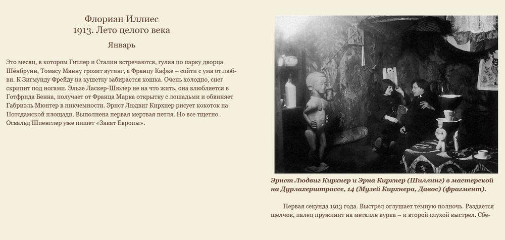 Перед вами хроника последнего мирного года накануне Первой мировой войны, в который произошло множество событий, ставших знаковыми для культуры XX века. В 1913-м вышел роман Прустя «По направлению к Свану», Шпенглер начал работать над «Закатом Европы», состоялась скандальная парижская премьера балета «Весна священная» Стравинского и концерт додекафонической музыки Шёнберга, была написана первая версия «Черного квадрата» Малевича, открылся первый бутик «Прада», Луи Армстронг взял в руки трубу, Сталин приехал нелегально в Вену, а Гитлер ее, наоборот, покинул. Автор, немецкий критик и эссеист, сменивший во время последнего кризиса место работы с газеты на аукционный дом, а круг интересов — с острой злободневности на старое искусство, создал увлекательнейшую панораму оживленной культурной жизни времен рождения модернизма. В прессе книгу назвали «громадным тизером» XX века и самым живым напоминанием о том, как то, что представлялось данностью, оказалось хрупким, даже беззащитным.