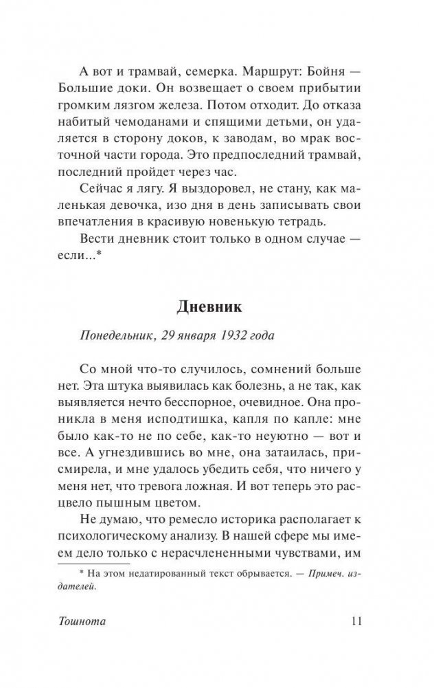 Тошнота - это суть бытия людей, застрявших "в сутолоке дня". Людей - брошенных на милость чуждой, безжалостной, безотрадной реальности. Тошнота - это невозможность любви и доверия, это - попросту неумение мужчины и женщины понять друг друга. Тошнота - это та самая "другая сторона отчаяния", по которую лежит Свобода. Но - что делать с этой проклятой свободой человеку, осатаневшему от одиночества?..