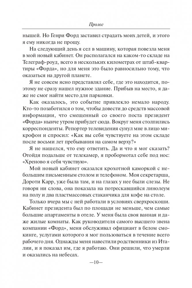 Ли Якокка — легенда американского менеджмента, решительный бизнесмен, который, вытащив «Крайслер» из пропасти, стал телезвездой и человеком, которого многие прочили в президенты США. Сын итальянского иммигранта Ли Якокка вырос в компании «Форд» до должности президента и возглавлял ее на протяжении восьми лет — однако интриги в высших эшелонах управления едва не погубили его карьеру. В обычном для него язвительном и критическом стиле он излагает читателю историю собственной жизни.
