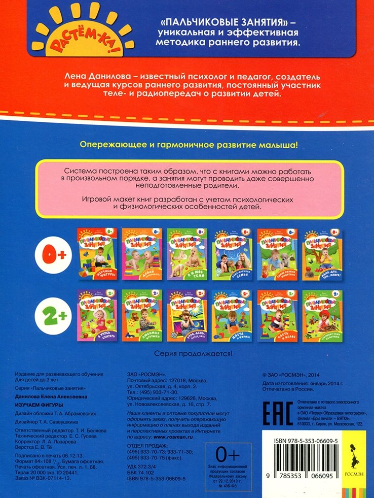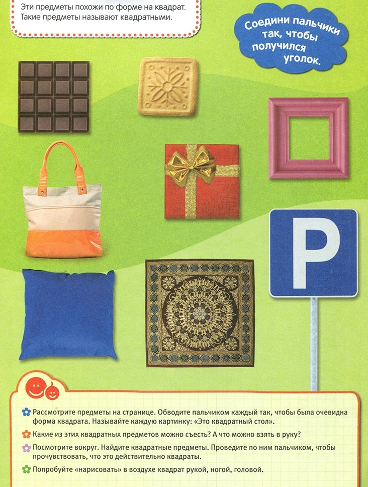 Эта книжка направлена на развитие речи, моторики рук и расширение словарного запаса у самых маленьких читателей - детей до двух лет. Мы не просто назовем разные фигуры, но и узнаем об их свойствах, поиграем с предметами, будем искать и находить, узнавать и сравнивать. Не торопите ребенка. Даже когда он запомнит названия фигур и легко будет узнавать их, ему предстоит следующий шаг, очень непростой, но важный: научиться видеть эти же фигуры в окружающих предметах. Старайтесь и вне игры с книжкой обращать внимание ребенка на то, какой формы тот или иной предмет. Книга построена на играх с картинками. Все картинки - разрозненные, в книге нет единого сюжета. Малыши в возрасте до двух лет пока не воспринимают сюжет, не способны следить за сюжетной линией. Мы просто играем с картинками. Чтобы игры были интереснее, разнообразнее, предлагаем вам взять несколько пуговиц и счетные палочки. Вместо счетных палочек можно использовать ватные палочки, небольшие карандаши. Это полезно и для развития мелкой моторики и сделает игру привлекательней. Под каждой иллюстрацией даны советы родителям. Их не нужно выполнять все сразу. Каждый раз, листая книгу вместе с малышом, обращайтесь к одному-двум советам. Никогда не требуйте от малыша выполнения заданий. Просто делайте все сами - показывайте, изображайте действия руками, пальцами, всем телом. Рано или поздно малыш станет повторять за вами.