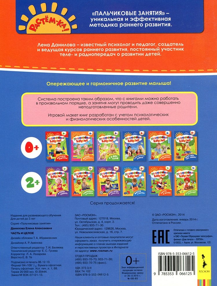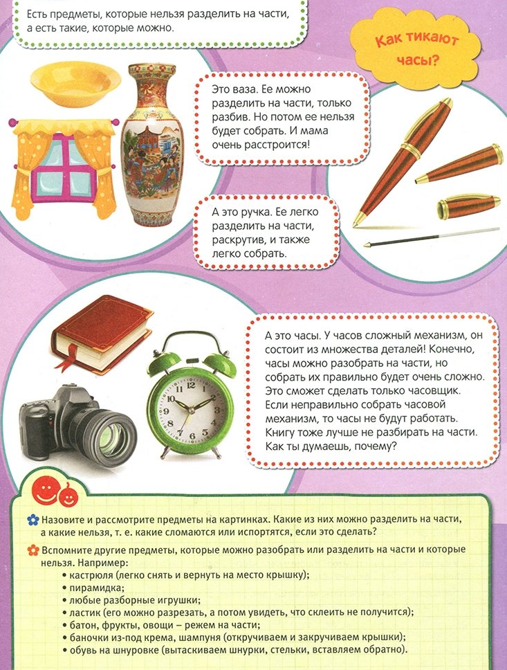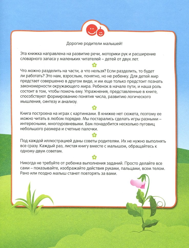 Эта книжка направлена на развитие речи, моторики рук и расширение словарного запаса у маленьких читателей - детей от двух лет. Что можно разделить на части, а что нельзя? Если разделить, то будет ли работать? Это нам, взрослым, понятно, но не ребенку. Для детей мир предстает совершенно в другом виде, и им еще только предстоит познать закономерности окружающего мира. Ребенок в начале пути, и наша роль состоит в том, чтобы помочь ему. Упражнения, представленные в книге, способствуют формированию понятия числа, развитию логического мышления, синтезу и анализу. Книга построена на играх с картинками. В книжке нет сюжета, поэтому ее можно читать в любом порядке. Мы постарались сделать игры разными - интересными, многоуровневыми. Вам понадобится несколько пуговиц небольшого размера и счетные палочки. Под каждой иллюстрацией даны советы родителям. Их не нужно выполнять все сразу. Каждый раз, листая книгу вместе с малышом, обращайтесь к одному-двум советам. Никогда не требуйте от ребенка выполнения заданий. Просто делайте все сами - показывайте, изображайте действия руками, пальцами, всем телом. Рано или поздно малыш станет повторять за вами.