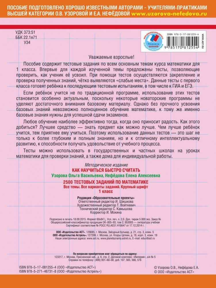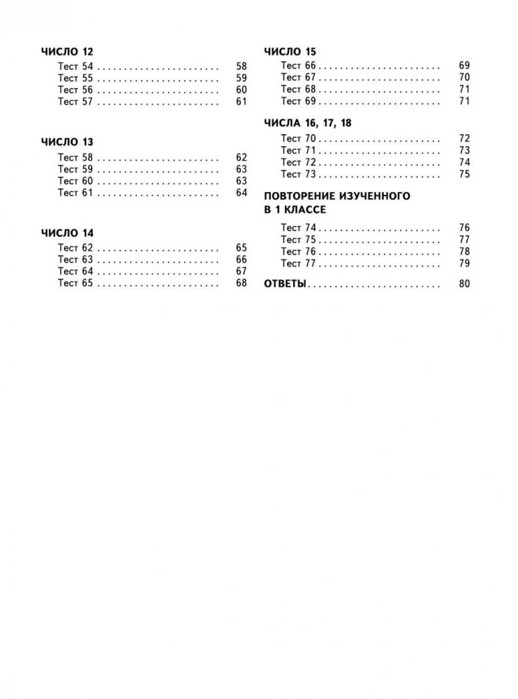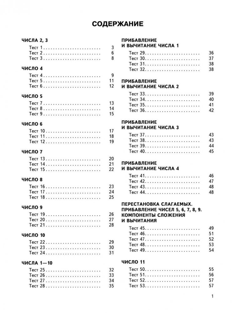 Пособие содержит тестовые задания по всем основным темам курса математики для 1 класса. Впервые для каждой изученной темы предложены тесты, позволяющие проверить, как ученик её усвоил. При помощи тестов осуществляются закрепление и проверка полученных знаний, чётко выявляются «слабые места». Данные тесты с первого класса готовят ребёнка к последующим тестовым испытаниям, в том числе к ГИА и ЕГЭ. Если ребёнок учится не по традиционной программе, использование этих тестов становится особенно актуальным, поскольку некоторые новаторские программы не уделяют достаточного внимания базовому материалу. Однако без прочного усвоения базовых знаний невозможно полноценное обучение математике, к тому же именно базовые знания нужны для успешной сдачи экзаменов. Любое обучение наиболее эффективно тогда, когда оно приносит радость. Как этого добиться? Лучшее средство – знать предмет как можно лучше. Чем лучше ребёнок учится, тем приятнее ему учиться. Поэтому использование данных тестов – это шаг не только к более глубоким и полным знаниям, но и к отличному интеллектуальному развитию, к способности получать удовольствие от учебного процесса. Тесты можно использовать в государственных и частных школах на уроках математики для проверки знаний, а также дома для индивидуальной работы.