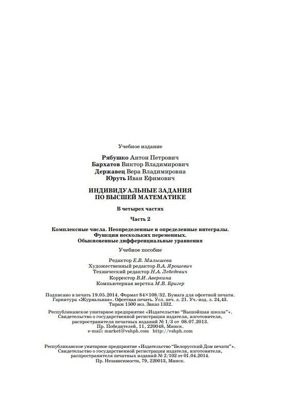 Индивидуальные задания по высшей математике. В 4 ч. Ч.2. Комплексные числа. Неопределенные и определенные интегралы. Функции нескольких переменных. Обыкновенные дифференциальные уравнения