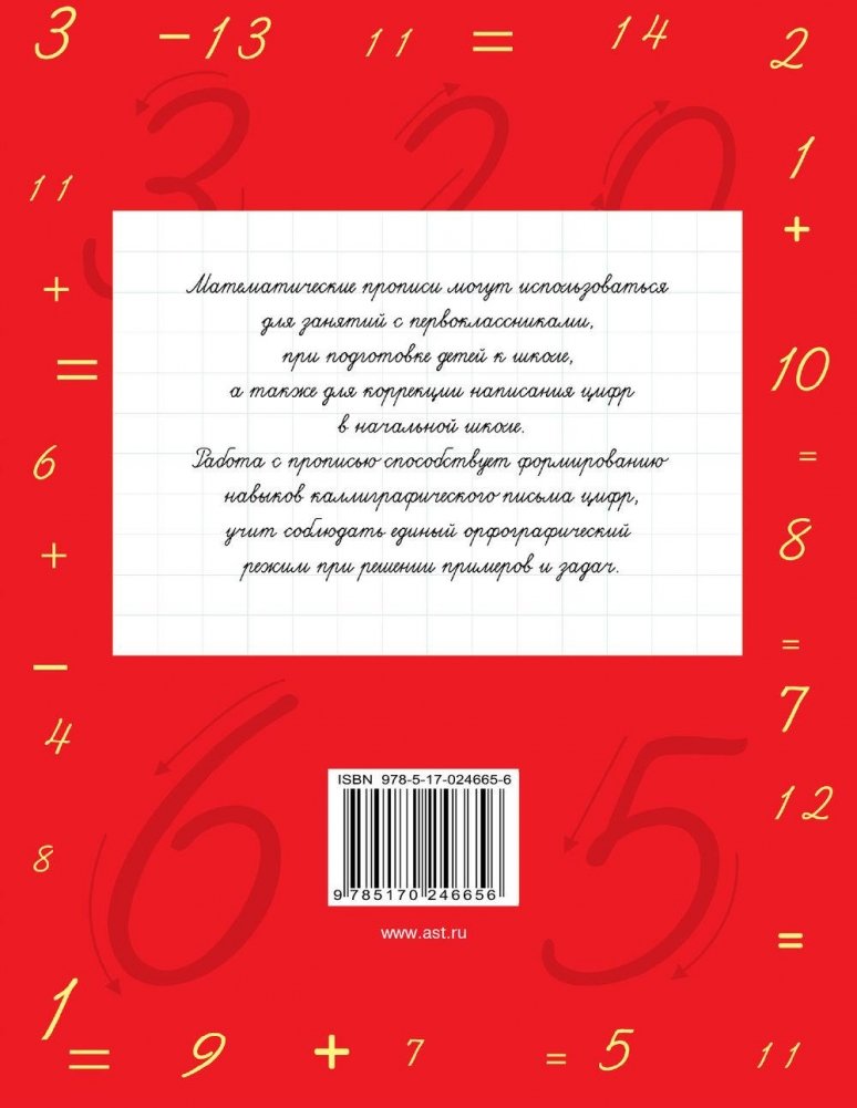 "Математические прописи" способствуют формированию навыков каллиграфического письма цифр, развитию мелкой моторики, учат соблюдать единый орфографический режим. Дети, не умеющие писать, за короткий период времени овладеют навыком правильного написания цифр.