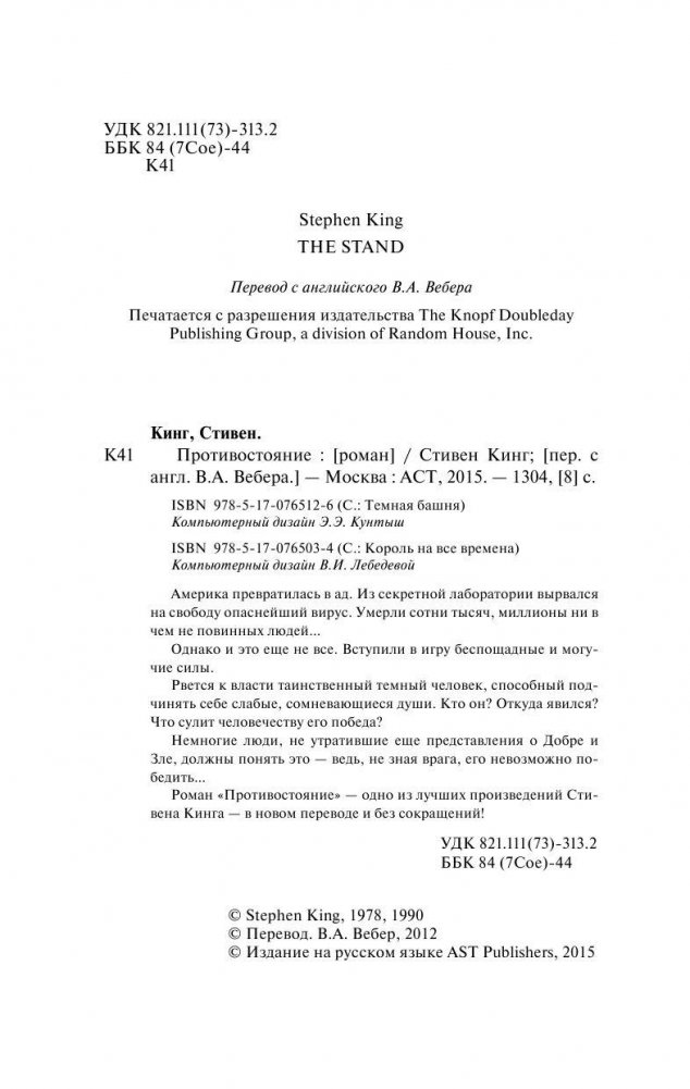 Стивен Кинг - "Противостояние" Стивен Кинг… "Король ужасов"? Да. Непревзойденный мастер проникновения в самые тайные, самые страшные, самые мрачные уголки человеческой души? Да! Жестокий, яростный и агрессивный эстет тьмы, чьи книги пугают и восхищают, возмущают - и все-таки привлекают? О да! ...Каждый из нас - лишь человек, стоящий над черной, адовой бездной собственных страхов. И только Стивен Кинг - великий Стивен Кинг! - может заставить нас шагнуть в эту бездну… Америка превратилась в ад. Из секретной лаборатории вырвался на свободу опаснейший вирус. Умерли сотни тысяч, миллионы ни в чем не повинных людей… Однако и это еще не все. Вступили в игру беспощадные и могучие силы. Рвется к власти таинственный темный человек, способный подчинять себе слабые, сомневающиеся души. Кто он? Откуда явился? Что сулит человечеству его победа? Немногие люди, не утратившие еще представления о Добре и Зле, должны понять это, - ведь, не зная врага, его невозможно победить… Роман "Противостояние" - одно из лучших произведений "короля ужасов" Стивена Кинга - в новом переводе и впервые без сокращений!