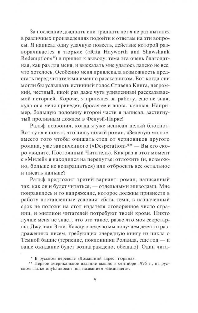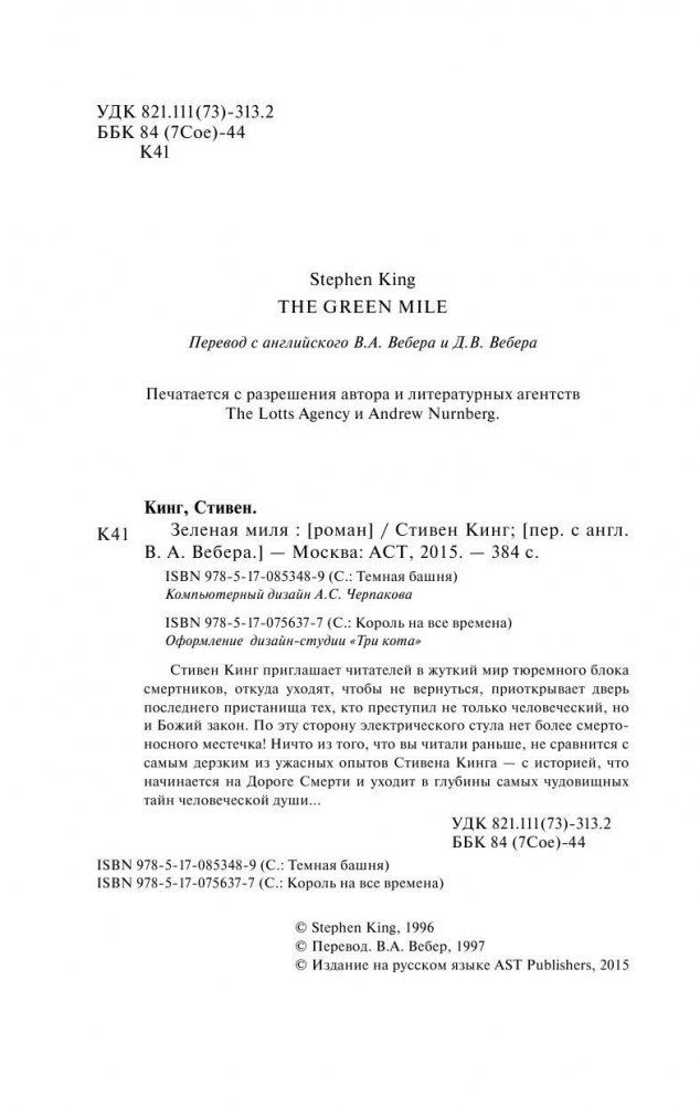 Стивен Кинг приглашает читателей в жуткий мир тюремного блока смертников, откуда уходят, чтобы не вернуться, приоткрывает дверь последнего пристанища тех, кто преступил не только человеческий, но и Божий закон. По эту сторону электрического стула нет более смертоносного местечка! Ничто из того, что вы читали раньше, не сравнится с самым дерзким из ужасных опытов Стивена Кинга - с историей, что начинается на Дороге Смерти и уходит в глубины самых чудовищных тайн человеческой души...