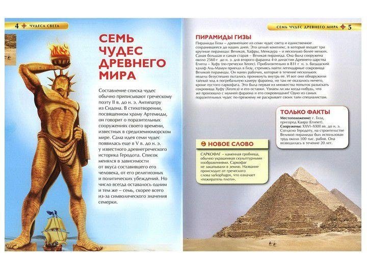 Чудеса света - одна из самых захватывающих тем для любого человека, который любит путешествовать. Кроме чудес Древнего мира, выделяют чудема Средневековья, чудеса природного и подводного мира, современные чудеса. На нашей планете столько всего необычного и красивого! Можно бесконечно черпать вдохновение для жизни и творчества. Пирамды Гизы, Стоунхендж, Фарфоровая башня в Накине, гора Эверест, озеро Байкал, тоннель под Ла-Маншем и еще много всего! Только взгляни на эти завораживающие иллюстрации с видами рукотворных и природных диковинок, и мир предстанет перед тобой во всем своем великолепии и величии.