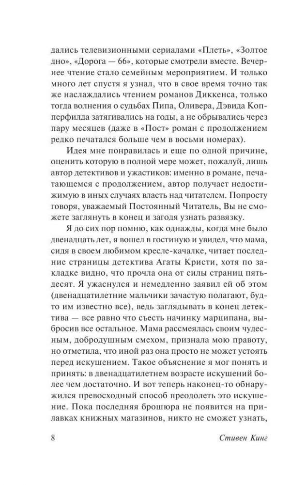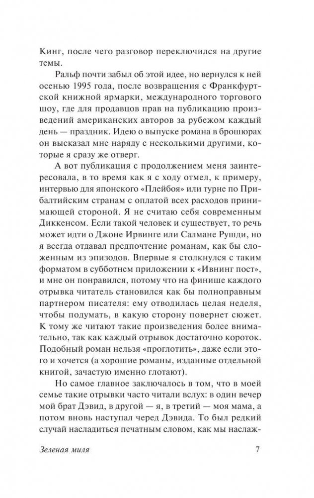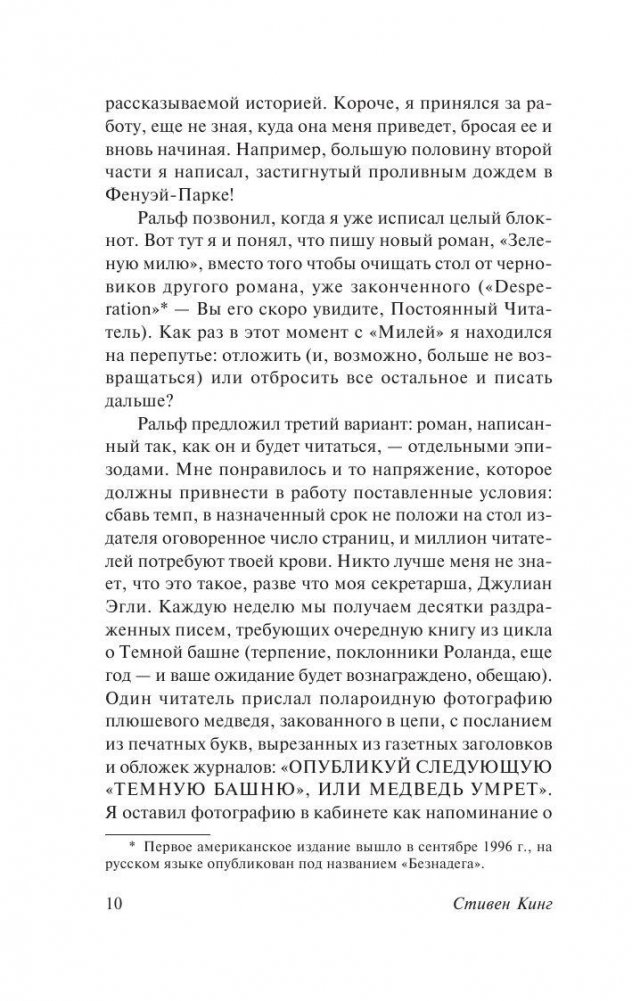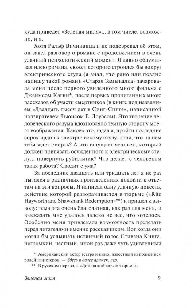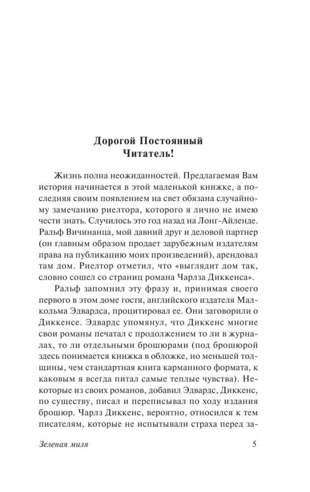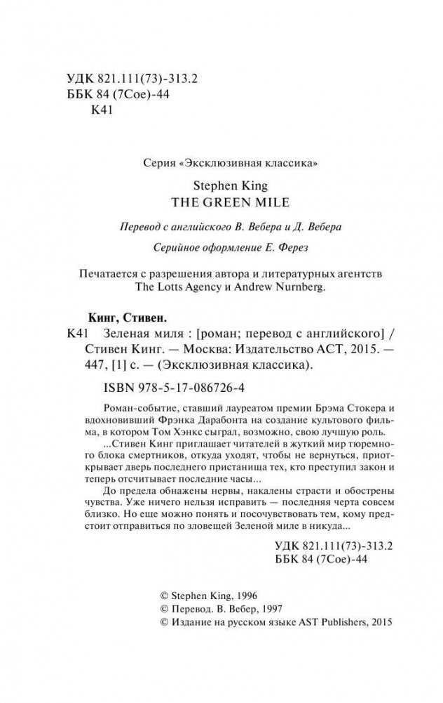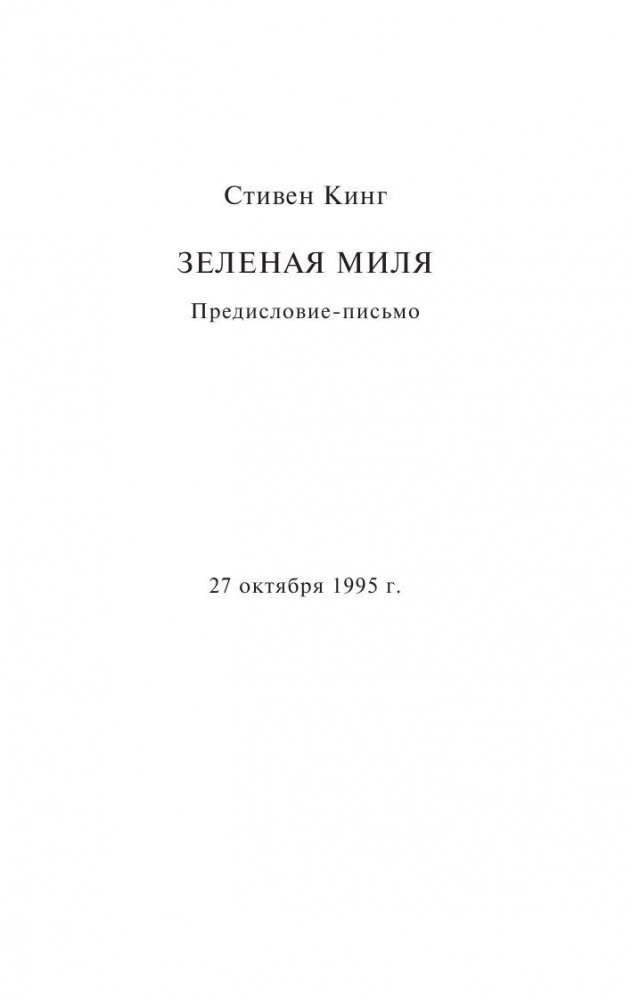 Роман-событие, ставший лауреатом премии Брэма Стокера и вдохновивший Фрэнка Дарабонта на создание культового фильма, в котором Том Хэнкс сыграл, возможно, свою лучшую роль. Стивен Кинг приглашает читателей в жуткий мир тюремного блока смертников, откуда уходят, чтобы не вернуться, приоткрывает дверь последнего пристанища тех, кто преступил закон и теперь отсчитывает последние часы... До предела обнажены нервы, накалены страсти и обострены чувства. Уже ничего нельзя исправить - последняя черта совсем близко. Но еще можно понять и посочувствовать тем, кому предстоит отправиться по зловещей Зеленой миле в никуда…