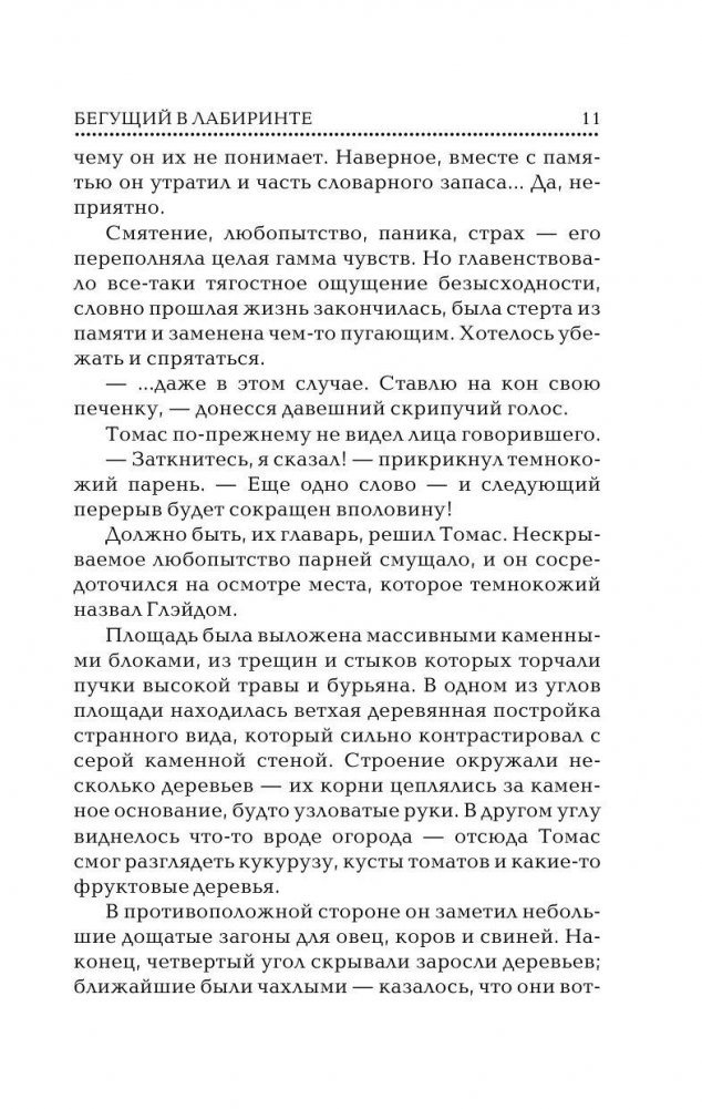 Вчера они были обычными парнями — слушали рэп и рок, бегали за девчонками, ходили в кино… Сегодня они — пешки в чужой игре, похищенные неизвестно кем для участия в чудовищном эксперименте. Их память стерта. Их новый дом — гигантский комплекс, отгороженный от еще более огромного Лабиринта стенами, которые раздвигаются утром и замыкаются вечером. И никто еще из тех, кто остался в Лабиринте после наступления ночи, не вернулся… Ребята не сомневаются: если они сумеют разгадать тайну Лабиринта, то вырвутся из заточения и вернутся домой. Но кто рискнет жизнью ради общей цели? Кто пойдет практически на верную смерть? Только двое — паренек по имени Томас и его подруга — Тереза…