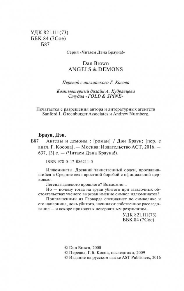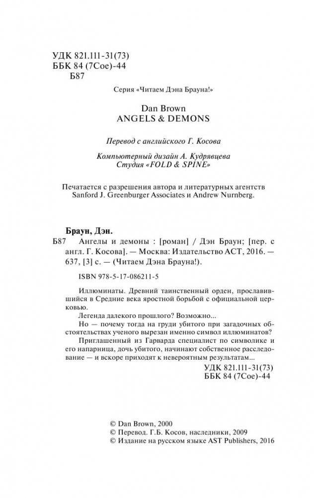Иллюминаты. Древний таинственный орден, прославившийся в Средние века яростной борьбой с официальной церковью. Легенда далекого прошлого? Возможно… Но — почему тогда на груди убитого при загадочных обстоятельствах ученого вырезан именно символ иллюминатов? Приглашенный из Гарварда специалист по символике и его напарница, дочь убитого, начинают собственное расследование — и вскоре приходят к невероятным результатам…