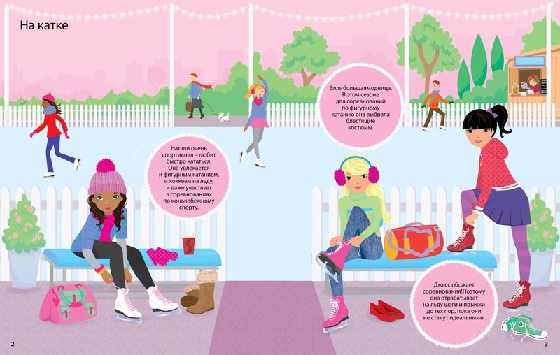 Познакомься с тремя подружками – Натали, Элли и Джесс. Они такие разные, но каждая из них обожает кататься на коньках. Одень девочек для тренировок на льду, подбери им костюмы для выступления, купи новые коньки и устрой настоящую церемонию награждения победителей. Читаем и играем! Развиваем внимание, воображение, мелкую моторику и художественный вкус.