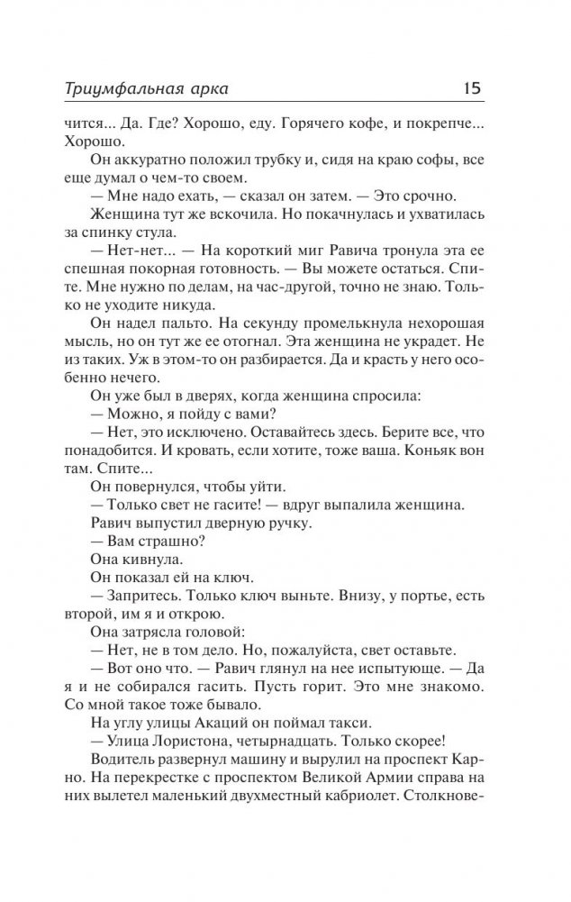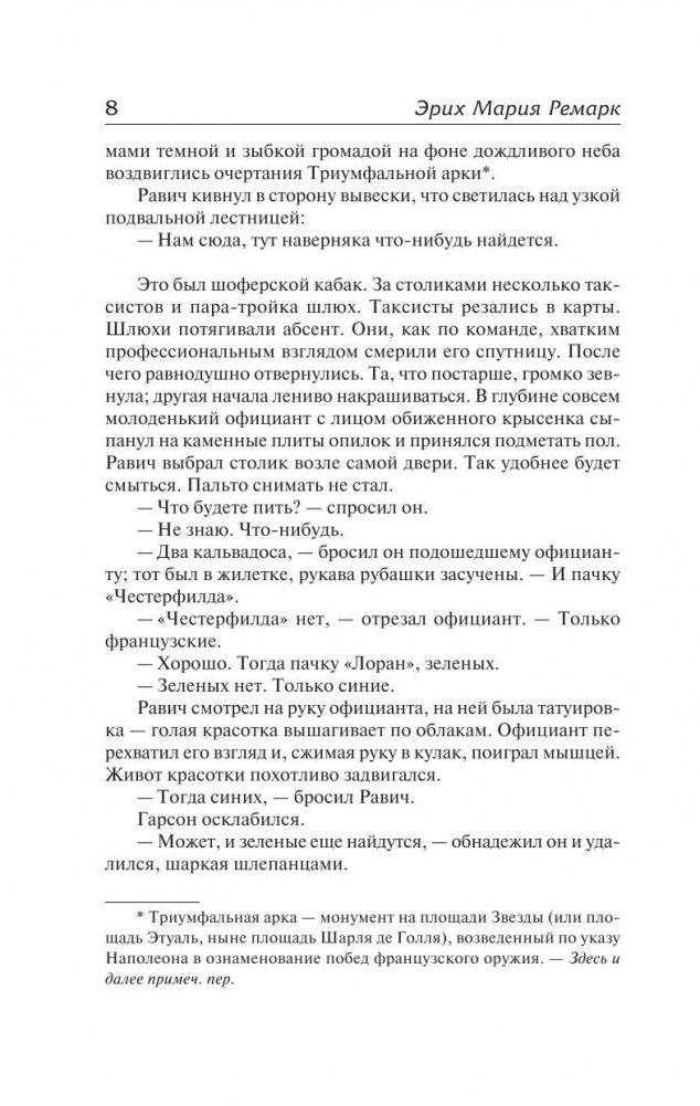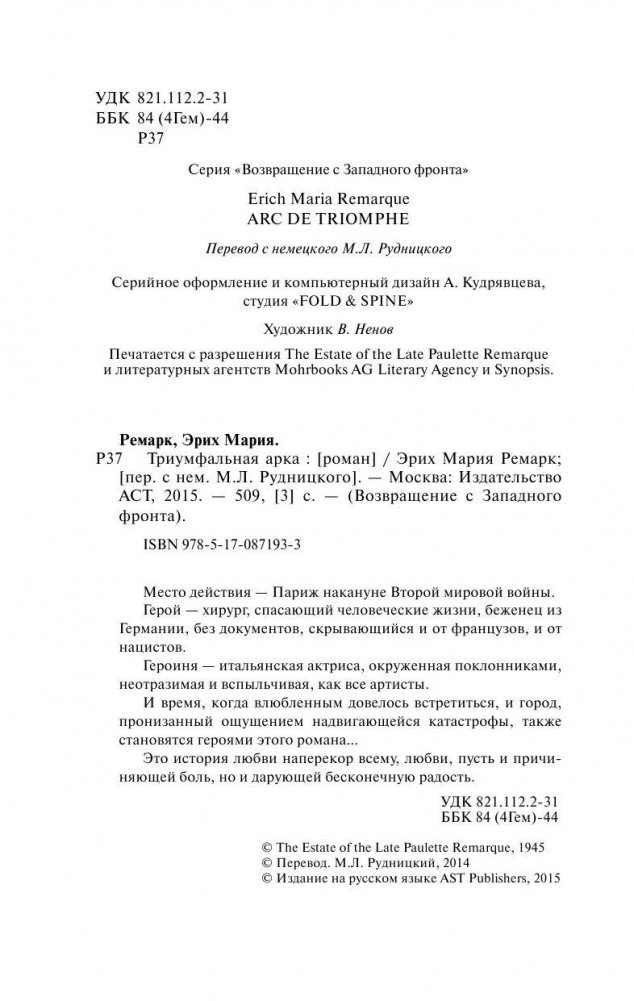 Роман Эриха Марии Ремарка "Триумфальная арка", впервые изданный 1945 году в США, пользовался большим успехом и стал бестселлером в короткие сроки. На сегодняшний день это один из самых востребованных и читаемых романов. Действие романа происходит в Париже в 1939 году. Это история хирурга, беженца из Германии , который скрывается и от нацистов, и от французов, и итальянской актрисы, своеобразной, вспыльчивой и неотразимой, которую окружают поклонники. Прототипом главной героини является Марлен Дитрих, с которой Ремарк жил в Париже перед началом Второй мировой войны и любовь к которой пронес через многие годы. Это роман о войне и смерти, и о любви наперекор всему. Он является одним из самых известных произведений Ремарка и считается одним из самых красивых и печальных, сильных и впечатляющих романов XX века. Роман был экранизирован дважды, обе экранизации с участием звезд мирового кинематографа - Ингрид Бергман и Шарля Буайе в первой, Энтони Хопкинса во второй, имели огромный успех и вошли в золотой фонд мирового кинематографа.