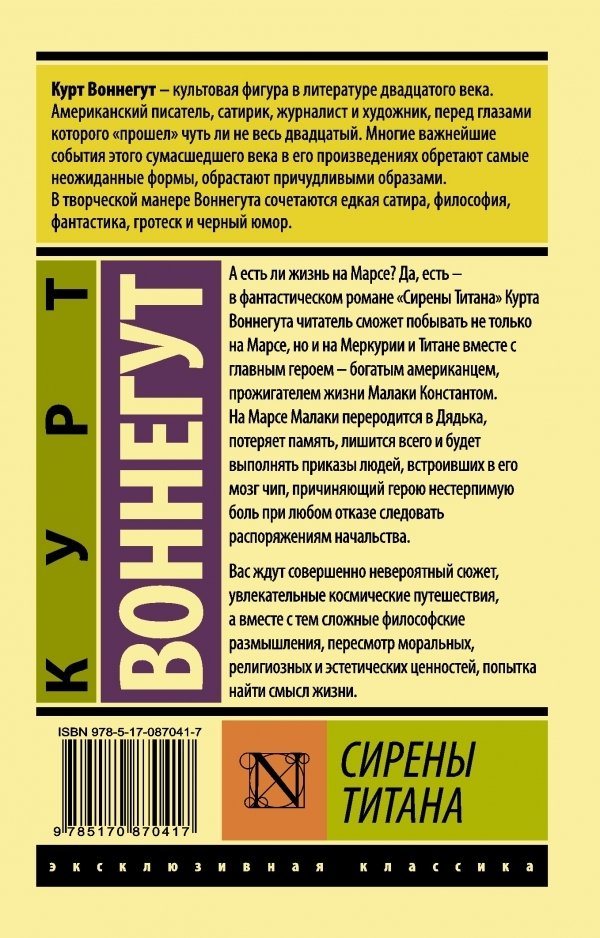 А есть ли жизнь на Марсе? Да, есть – в фантастическом романе «Сирены Титана» Курта Воннегута читатель сможет побывать не только на Марсе, но и на Меркурии и Титане вместе с главным героем – богатым американцем, прожигателем жизни Малаки Константом. На Марсе Малаки переродится в Дядька, потеряет память, лишится всего и будет выполнять приказы людей, встроивших в его мозг чип, причиняющий герою нестерпимую боль при любом отказе следовать распоряжениям начальства. Вас ждет совершенно невероятный сюжет, увлекательные космические путешествия, а вместе с тем сложные философские размышления, пересмотр моральных, религиозных и эстетических ценностей, попытка найти смысл жизни.