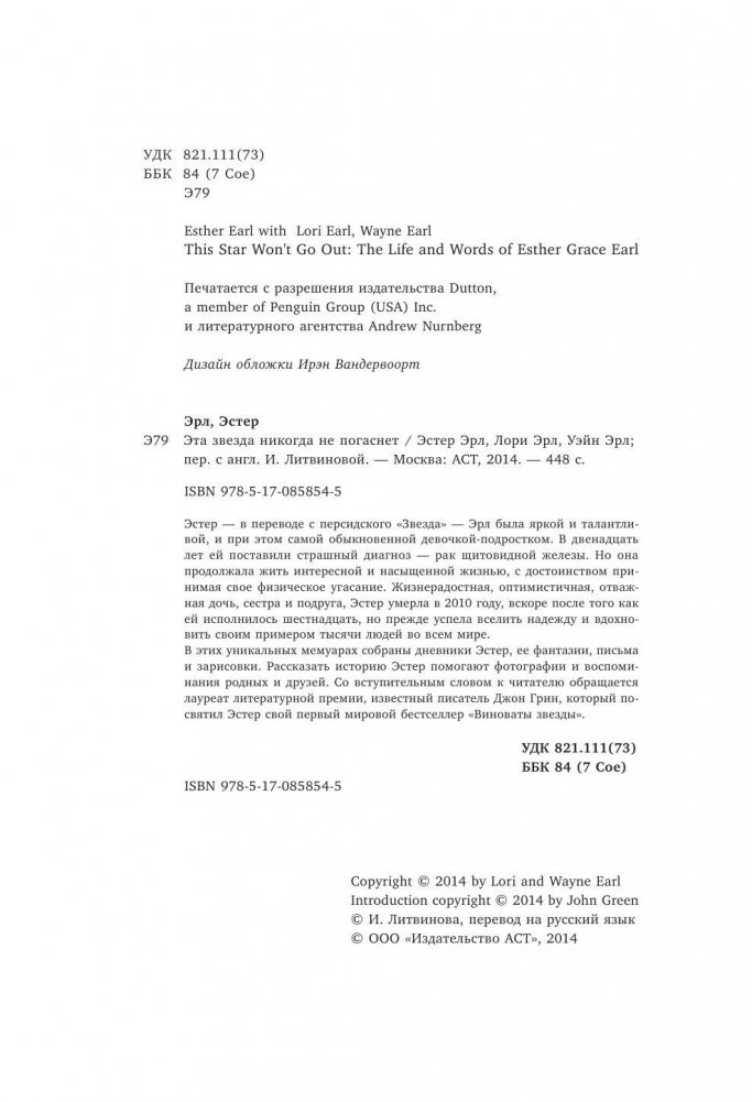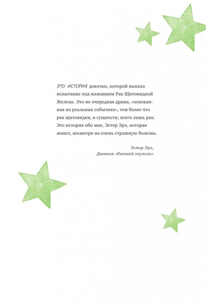 Эстер — в переводе с персидского «Звезда» — Эрл была яркой и талантливой, и при этом самой обыкновенной девочкой-подростком. В двенадцать лет ей поставили страшный диагноз — рак щитовидной железы. Но она продолжала жить интересной и насыщенной жизнью, с достоинством принимая свое физическое угасание. Жизнерадостная, оптимистичная, отважная дочь, сестра и подруга, Эстер умерла в 2010 году, вскоре после того как ей исполнилось шестнадцать, но прежде успела вселить надежду и вдохновить своим примером тысячи людей во всем мире. В этих уникальных мемуарах собраны дневники Эстер, ее фантазии, письма и зарисовки. Рассказать историю Эстер помогают фотографии и воспоминания родных и друзей. Со вступительным словом к читателю обращается лауреат литературной премии, известный писатель Джон Грин, который посвятил Эстер свой первый мировой бестселлер «Виноваты звезды».