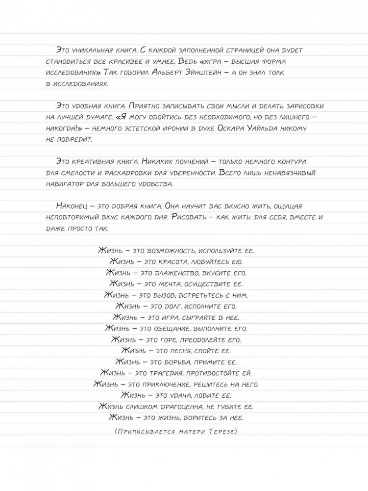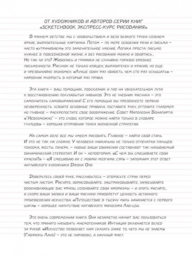Скетчбук - это настоящая находка для творческих людей. Он может служить одновременно и учебником для рисования, и тетрадью для записей и рисунков, ведь на его страницах есть и упражнения для начинающих рисовальщиков, и пространство для собственных креативных идей. Удобный корешок на пружине позволяет повернуть блокнот на 360 градусов и использовать в качестве планшета, чтобы записывать и зарисовывать прямо на ходу!