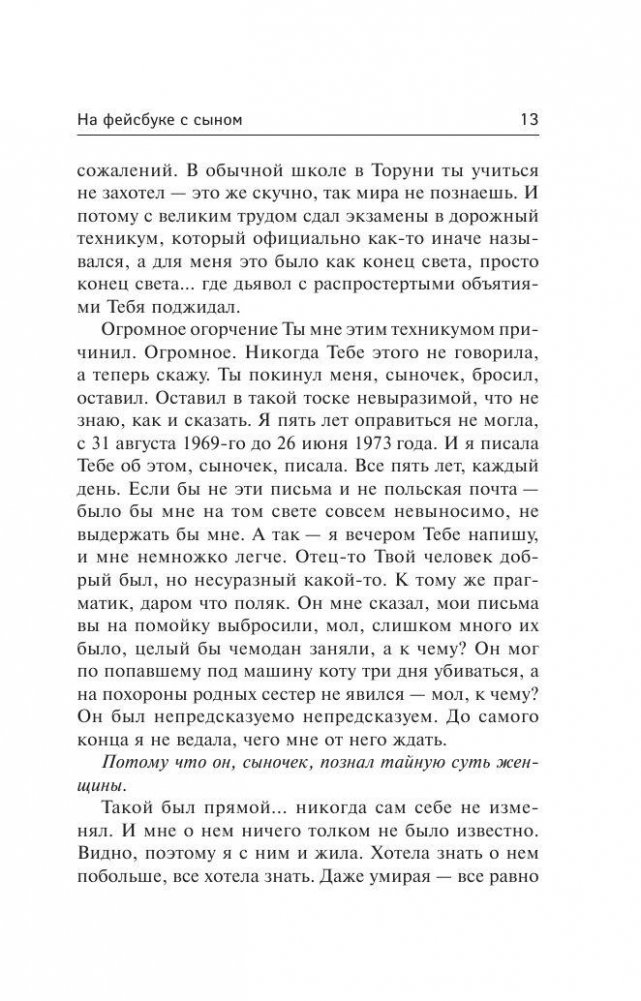 "На фейсбуке с сыном" - глубоко личный рассказ о пережитом и перечувствованном. Это горькое и прекрасное откровение о внутреннем мире человека с измученной сомнениями душой - о жизни и любви, о мире, который божественно несправедлив, в котором чувственное всегда сопряжено со страданием.