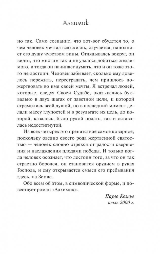 "Алхимик" — самый известный роман бразильского писателя Пауло Коэльо, любимая книга миллионов людей во всем мире. В юности люди не боятся мечтать, все кажется им возможным. Но проходит время, и таинственная сила принимается им внушать, что их желания неосуществимы. "Добиться воплощения Своей Судьбы — вот единственная подлинная обязанность человека..." — утверждает Пауло Коэльо. Этот, ставший культовым, роман-притча способен изменить жизнь своих читателей.