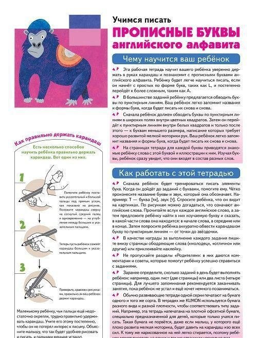 Эта рабочая тетрадь познакомит вашего ребенка с прописными буквами английского алфавита, научит уверенно держать в руках карандаш и проводить линии. Выполняя задания, ребенок будет запоминать названия и формы прописных букв, постепенно научится писать их и увидит, что они входят в состав разных слов.
