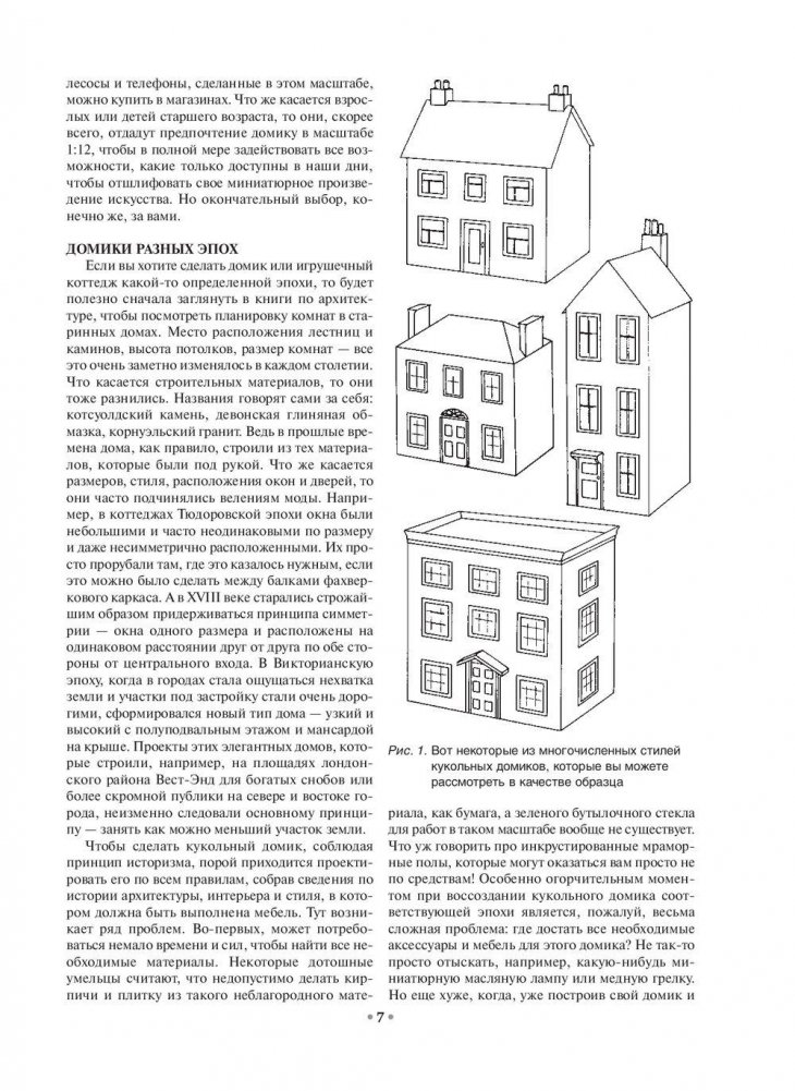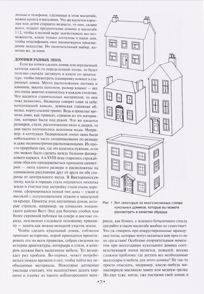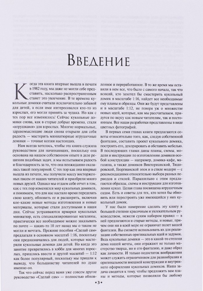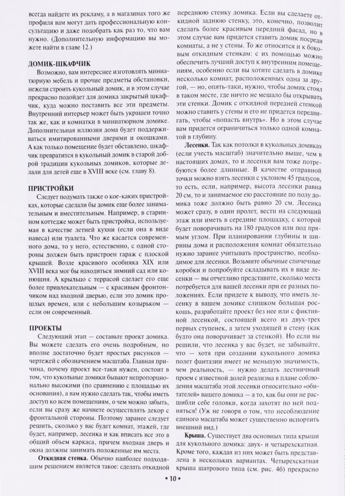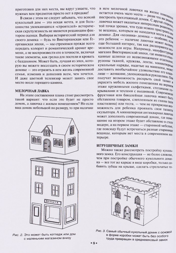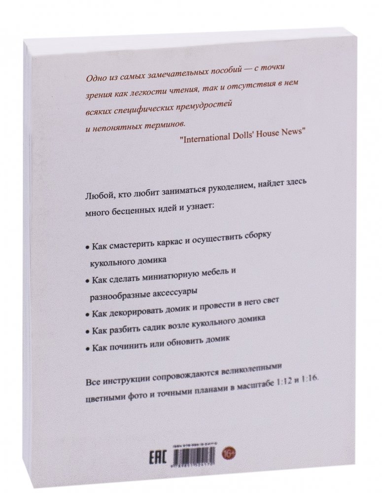 Перед вами одно из самых замечательных пособий — с точки зрения как легкости чтения, так и отсутствия в нем всяких специфических премудростей и непонятных терминов. Любой, кто любит заниматься рукоделием, найдет здесь много бесценных идей и узнает: как смастерить каркас и осуществить сборку кукольного домика, как сделать миниатюрную мебель и разнообразные аксессуары, как декорировать домик и провести в него свет, как разбить садик возле кукольного домика, как починить или обновить домик. Все инструкции сопровождаются великолепными цветными фото и точными планами в масштабе 1:12 и 1:16.