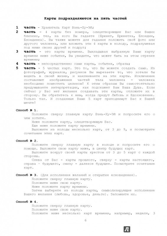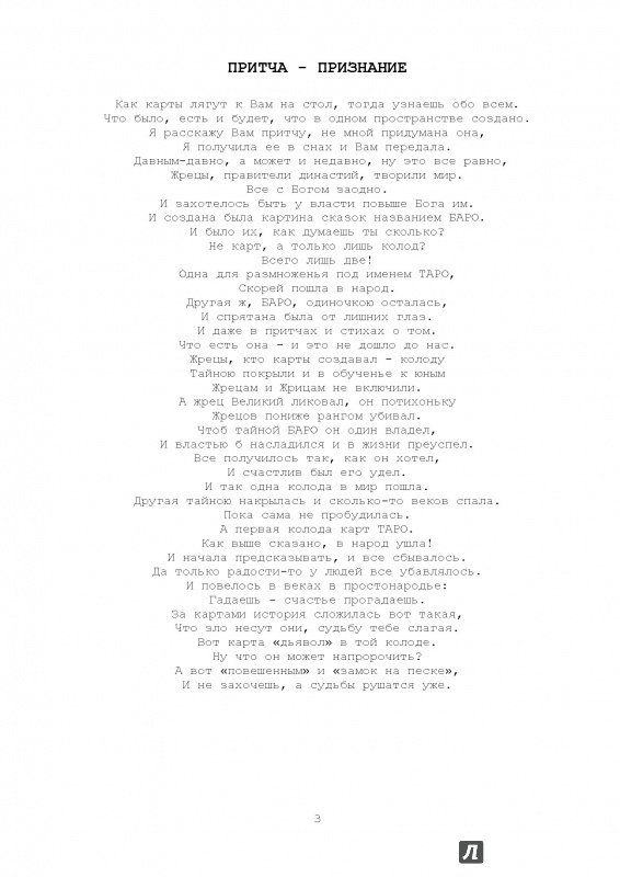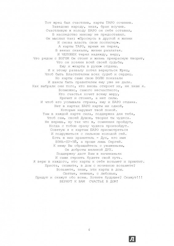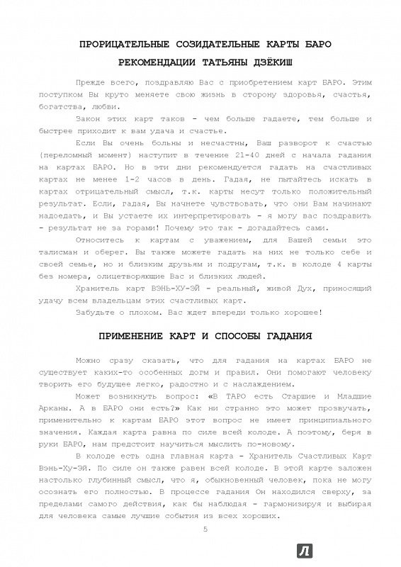 Нет в картах БАРО карты ни одной, которые нарушат душевный твой покой. Там в каждой карте сила, поддержка для тебя. Чтоб сам, своей Душою, творил ты чудеса. Не веришь, ну так что ж, сомнения пройдут, когда с тобою сразу чудеса произойдут. При гадании: притягивают удачу, счастье, любовь, досттаток, здоровье; автоматически снимает сглаз, порчу; предсказывают счастливое будущее; оберегают семью; открывают ясновидение. Состав: карты 100x70 мм – 66 штук; карты 70x50 мм – 10 штук; брошюра (24 листа).