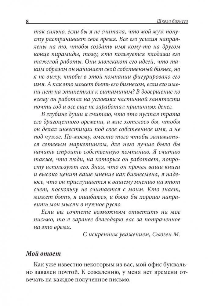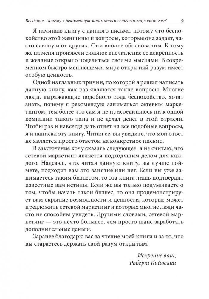 Сетевой маркетинг является настоящей школой бизнеса для людей, которые желают овладеть навыками предпринимательства и создать собственное дело. "Но что же заставило Роберта Кийосаки, никогда не занимавшегося этим видом бизнеса, посвятить ему целую книгу? " - спросите вы. Дело в том, что для сетевого маркетинга характерны 8 скрытых преимуществ — и в их суть необходимо вникнуть каждому, чья цель не просто высокая зарплата, а настоящее богатство.