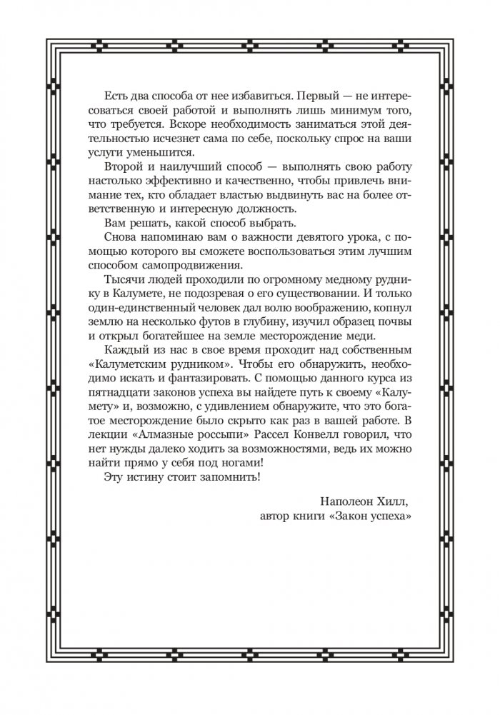 Эта книга представляет собой полное классическое издание всемирно известной серии уроков Наполеона Хилла. Если ваша жизнь стала ярче и богаче благодаря знаменитой работе «Думай и богатей», то «Закон успеха» вам обязательно понравится. Он раскрывает самую суть философии, на которой основывается большинство мотивационных книг. Данное руководство к действию станет четким планом достижения успеха в любой сфере деятельности. Оно научит вас думать как победитель, стать победителем и получить заслуженные награды. Будьте готовы к тому, что Наполеон Хилл поможет вам осуществить самые заветные мечты.