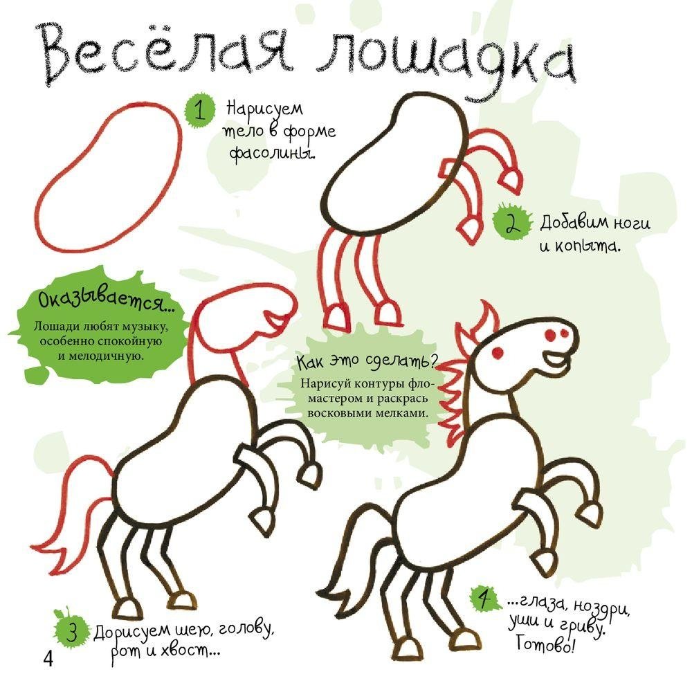 Нарисовать лошадку-циркачку, дрессированную лошадку и пони-участницу соревнований поможет веселая книжка! Простейшие пошаговые картинки + забавные факты из жизни животных — и даже самый маленький ребенок сможет нарисовать целое лошадиное семейство!