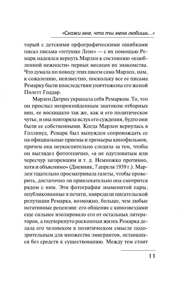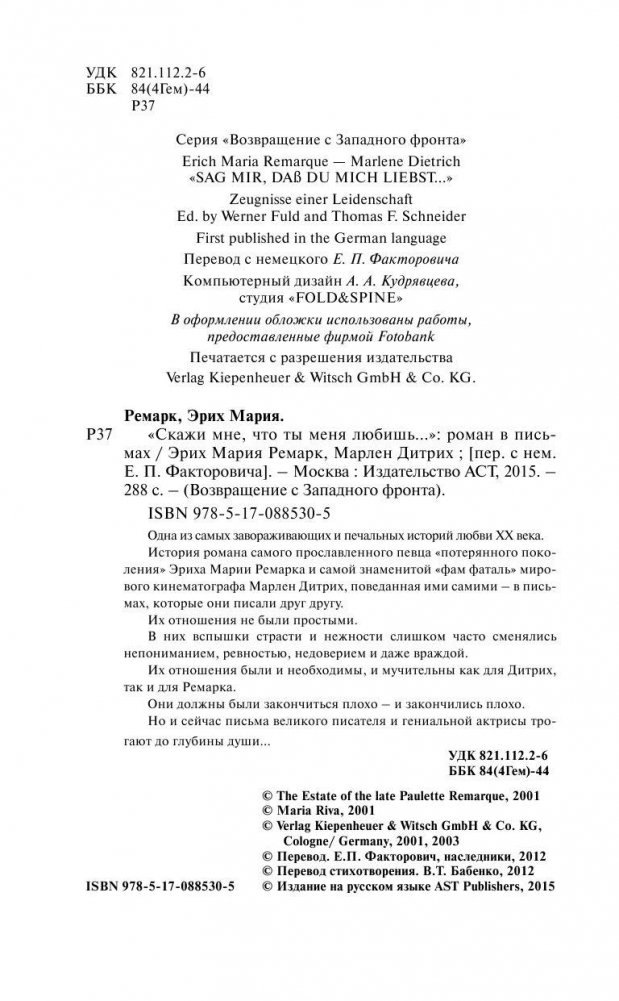 Одна из самых завораживающих и печальных историй любви ХХ мирового века. История романа самого прославленного певца "потерянного поколения" Эриха Марии Ремарка и самой знаменитой "фам фаталь" мирового кинематографа Марлен Дитрих, поведанная ими самими – в письмах, которые они писали друг другу. Их отношения не были простыми. В них вспышки страсти и нежности слишком часто сменялись непониманием, ревностью, недоверием и даже враждой. Их отношения были и необходимы, и мучительны как для Дитрих, так и для Ремарка. Они должны были закончиться плохо – и закончились плохо. Но и сейчас письма великого писателя и гениальной актрисы трогают до глубины души...