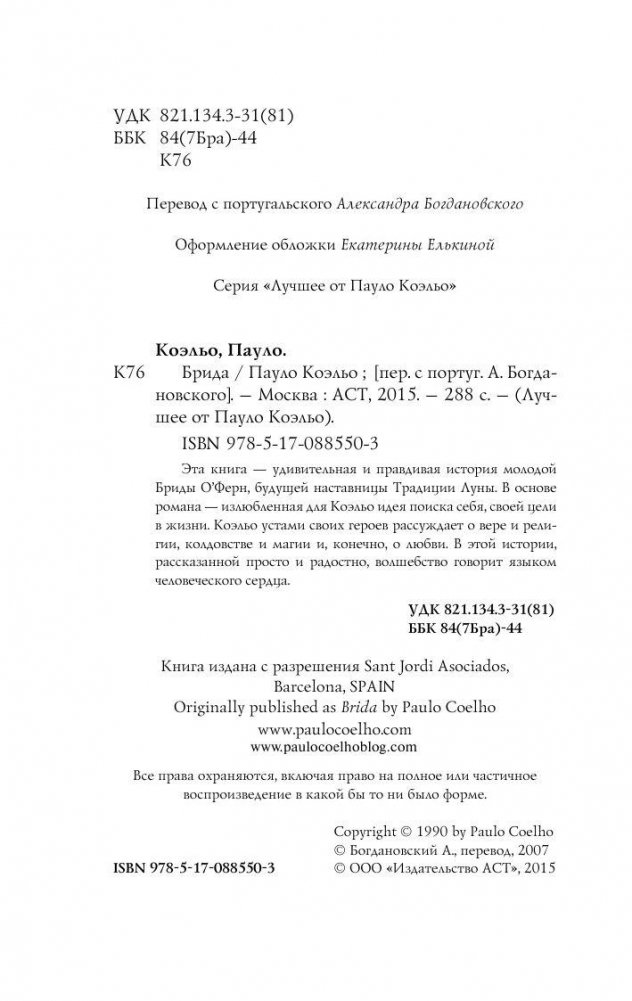 Эта книга - удивительная и правдивая история молодой Бриды О'Ферн, будущей наставницы Традиции Луны. В основе романа — излюбленная для Коэльо идея поиска себя, своей цели в жизни. Коэльо устами своих героев рассуждает о вере и религии, колдовстве и магии и конечно о любви. В этой истории, рассказанной просто и радостно, волшебство говорит языком человеческого сердца.