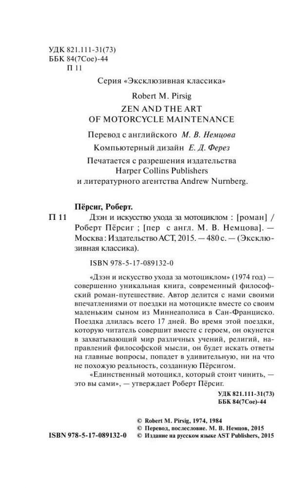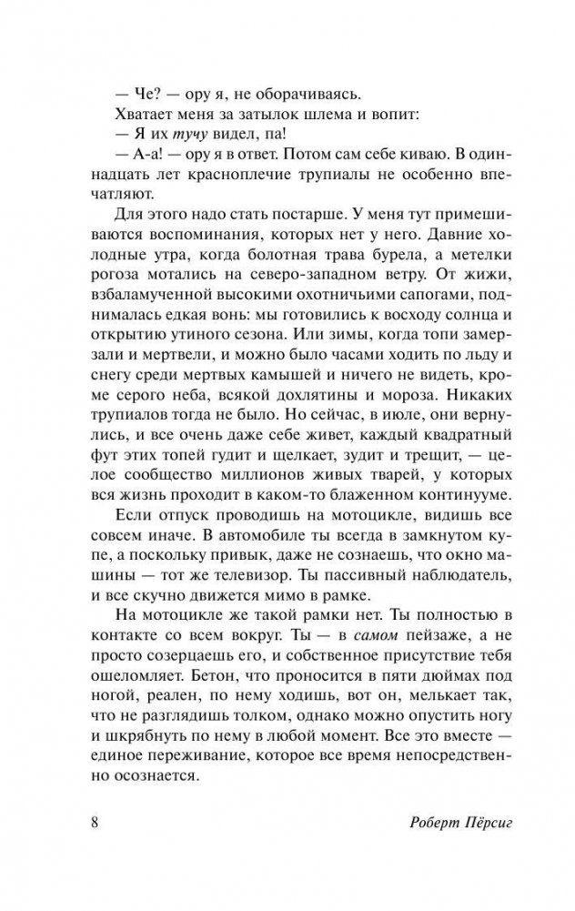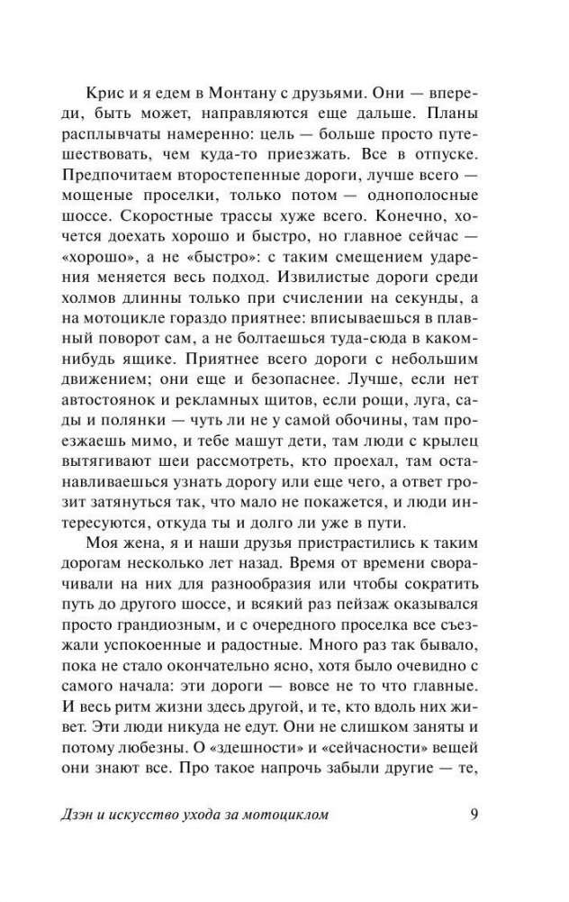 «Дзэн и искусство ухода за мотоциклом» (1974 год) - совершенно уникальная книга, современный философский роман-путешествие. Автор делится с нами своими впечатлениями от поездки на мотоцикле вместе со своим маленьким сыном, из Миннеаполиса в Сан-Франциско. Поездка длилась всего 17 дней. Во время этой поездки, которую читатель совершит вместе с героем, он окунется в захватывающий мир различных учений, религий, направлений философской мысли, он будет искать ответы на главные вопросы, попадет в удивительную, ни на что не похожую реальность, созданную Персигом. "Единственный мотоцикл, который стоит чинить, - это вы сами" - утверждает Роберт Персиг.