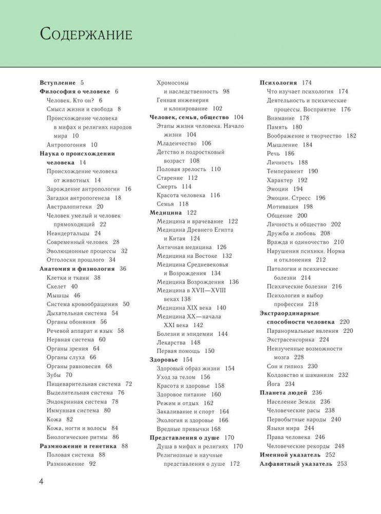 Книга "Человек" рассказывает о том, что представляет собой человек с точки зрения разных наук - философии, антропологии, анатомии, физиологии, генетики, медицины, психологии, этнологии и других дисциплин. Книга расскажет не только о фактах об организме человека, но и о замечательных ученых разных эпох и народов, чей вклад в науку обогатил нас знаниями о самих себе. Приведены наиболее интересные научные гипотезы, факты, теории, суждения. Материал энциклопедии сгруппирован по областям знаний. Для облегчения доступа к нужной информации в книге есть алфавитный и именной указатели. Для школьников и широкого круга читателей.