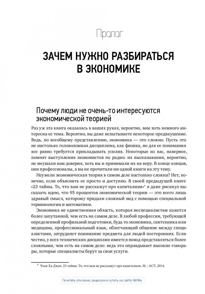 В этой книге экономист из Кембриджа Ха-Джун Чанг в занимательной и доступной форме объясняет, как в реальных условиях работает мировая экономика. Чанг предлагает читателю идеи, которые нельзя найти в учебниках по экономике, и делает это с глубоким знанием истории, остроумием и легким пренебрежением к традиционным экономическим теориям. В отличие от многих экономистов, предлагающих один взгляд на свой предмет, Чанг рассматривает множество теорий — от классической до кейнсианской, показывая преимущества и недостатки каждой из них, и убедительно демонстрирует, что единого правильного подхода для объяснения функционирования экономики нет. Взамен одной верной теории автор предлагает набор инструментов, которые помогут вам лучше понять, как функционирует современная экономика в глобальном мире, где все связано между собой. Через будущее европейской валюты, неравенство в Китае, состояние промышленности в США и другие детали вы узнаете, как глобальная экономика работает и почему она влияет на вашу жизнь.