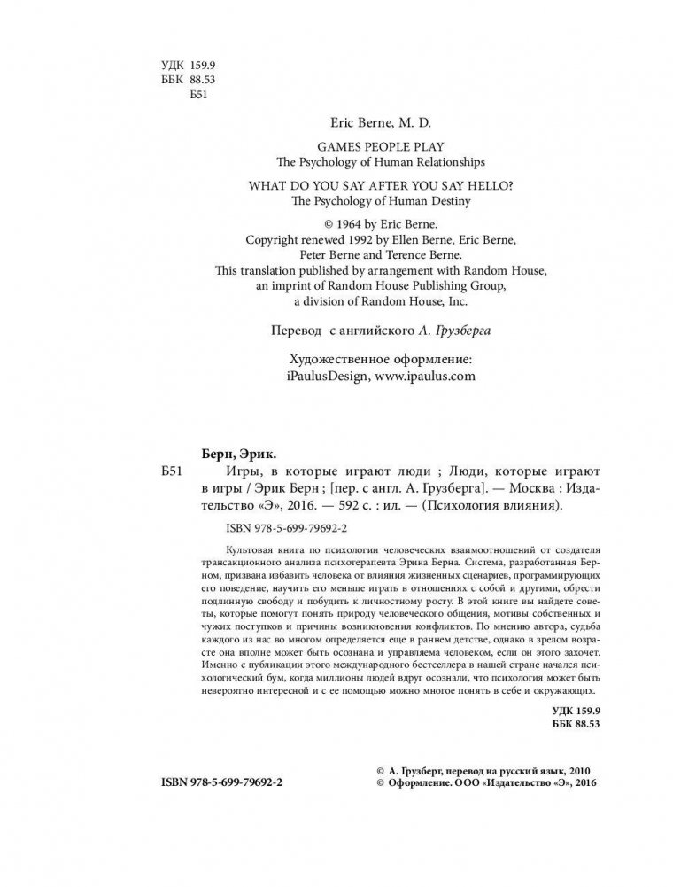 Эрик Леннард Берн (1910-1970) – одна из ключевых фигур в современной психологии, создатель оригинального направления в психотерапии – «трансакционного анализа», рассматривающего игру в качестве основы человеческих взаимоотношений. Разработка этой теории принесла ученому мировую известность. Культовая книга по психологии человеческих взаимоотношений от создателя трансакционного анализа психотерапевта Эрика Берна. Система, разработанная Берном, призвана избавить человека от влияния жизненных сценариев, программирующих его поведение, научить его меньше играть в отношениях с собой и другими, обрести подлинную свободу и побудить к личностному росту. В этой книге вы найдете советы, которые помогут понять природу человеческого общения, мотивы собственных и чужих поступков и причины возникновения конфликтов. По мнению автора, судьба каждого из нас во многом определяется еще в раннем детстве, однако в зрелом возрасте она вполне может быть осознана и управляема человеком, если он этого захочет. Именно с публикации этого международного бестселлера в нашей стране начался психологический бум, когда миллионы людей вдруг осознали, что психология может быть невероятно интересной и с ее помощью можно многое понять в себе и окружающих.