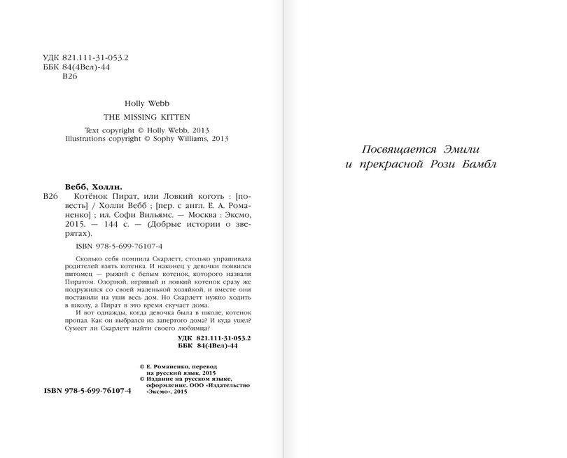 Холли Вебб, известная английская писательница, выпустившая более 30 книг для детей младшего возраста. Её книги пользуются большой популярностью. Скарлетт всегда мечтала взять котёнка и долго упрашивала родителей. И вот, наконец, её мечта сбылась, - очаровательный котёнок, весёлый, ловкий и озорной, которого Скарлетт назвала Пиратом. Они сразу же подружились, им было так весело играть вместе. Но однажды, вернувшись из школы, Скарлетт обнаружила, что котёнок пропал. И теперь девочка думает только о том, как найти своего любимца.