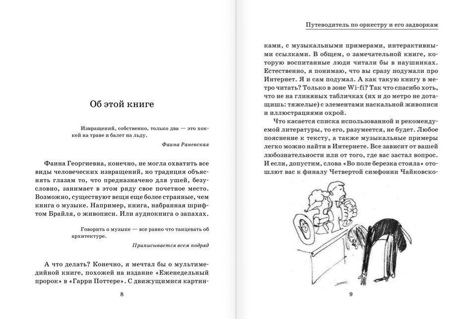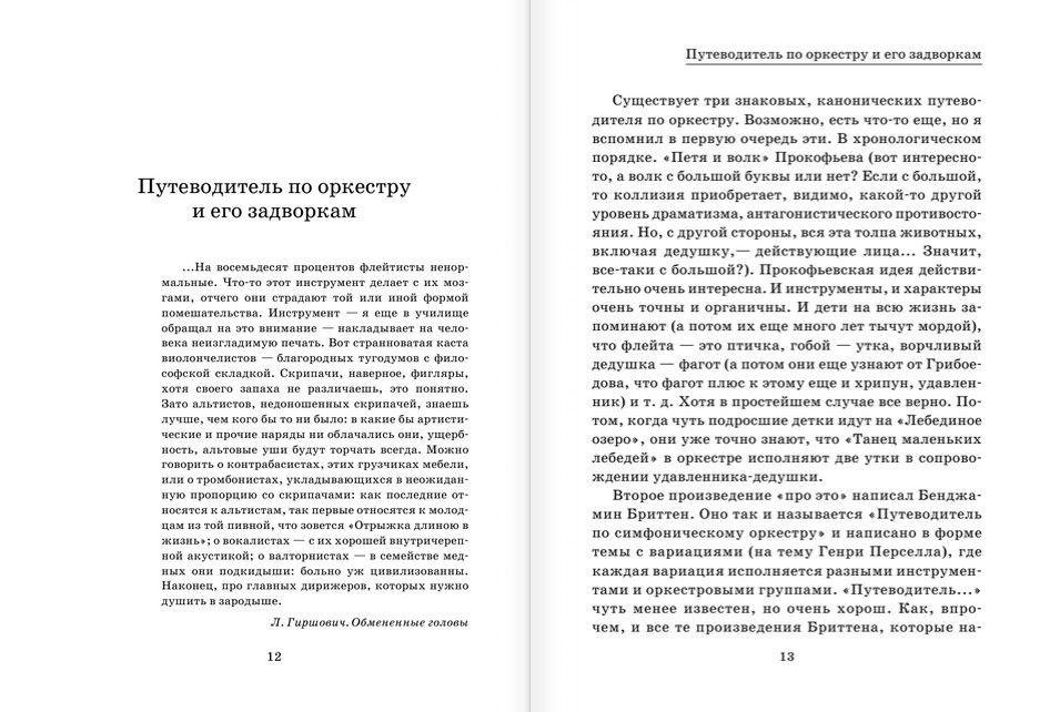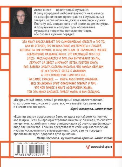 Эта книга рассказывает про симфонический оркестр и про то, как он устроен, про музыкальные инструменты и людей, которые на них играют. И про тех, кто на них не играет, тоже. Кстати, пусть вас не обманывает внешне добродушное название книги. Это настоящий триллер. Здесь рассказывается о том, как вытягивают жилы, дергают за хвост, натягивают шкуру на котел и мучают детей. Да и взрослых тоже. Поэтому книга под завязку забита сценами насилия. Что никоим образом не исключает бесед о духовном. А это страшно уже само по себе. Но самое ужасное — книга абсолютно правдива. Весь жизненный опыт однозначно и бескомпромиссно говорит о том, что чем точнее в книге изображена жизнь, тем эта книга смешнее. Правду жизни я вам обещаю.