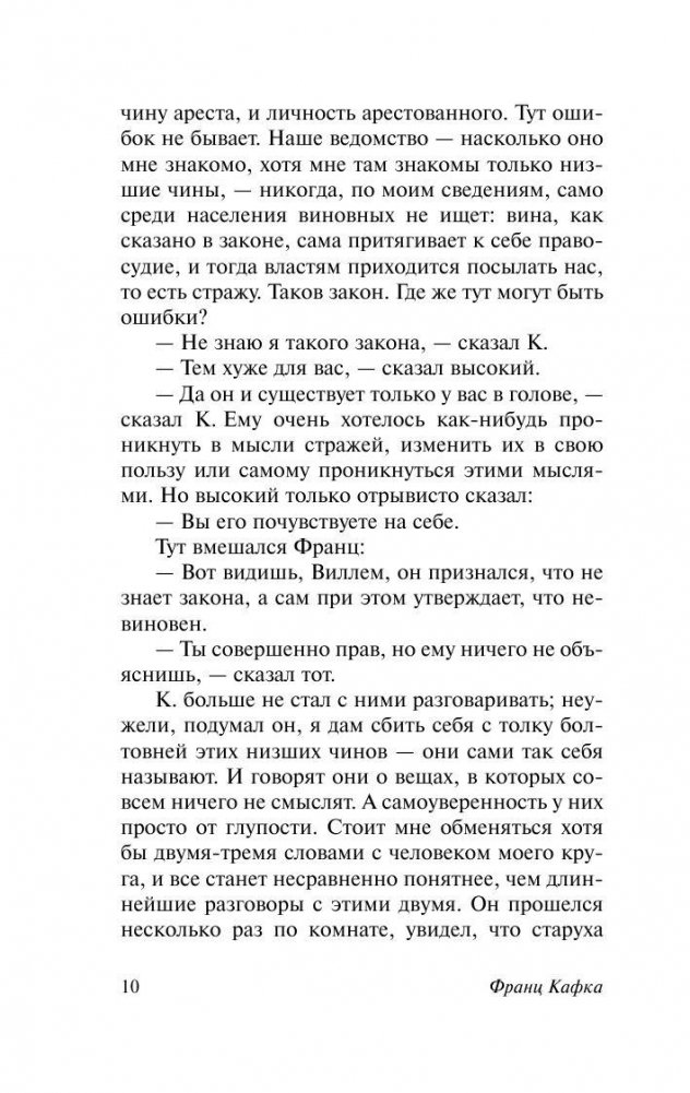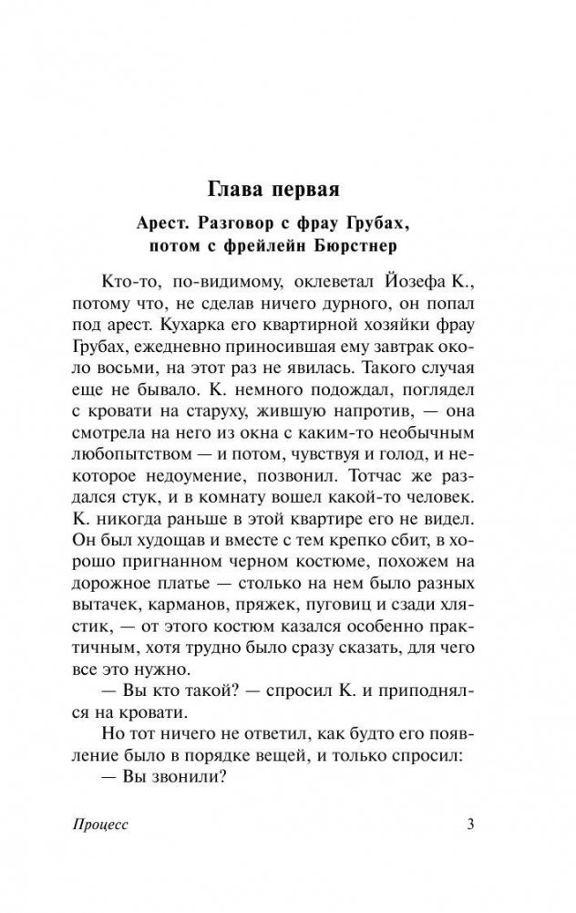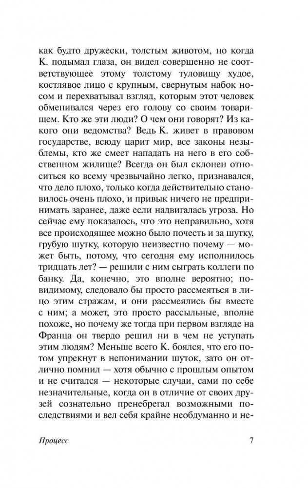 Роман, ставший своеобразным символом творчества Франца Кафки. Интересно, что Кафка не оставил никаких подсказок, по которым можно было бы как-то воссоздать фабулу романа. Главы не были пронумерованы и содержались в отдельных конвертах. Йозеф К. — рациональный герой среди абсурдного общества. Его ничем не примечательная, даже в чем-то банальная жизнь шла своим чередом, пока его не известили о том, что против него начат процесс. Абсурдность происходящего с К. пугает именно своей приземленной, холодной обыденностью, повседневностью и даже странной логичностью творящегося с героем ужаса, противостоять которому он не в силах. Где судья, которого он ни разу не видел? Где высокий суд, куда он так и не попал? Он виноват просто потому, что каждый человек в этой жизни может быть в чем-то виноват. Страшная и нелепо смешная атмосфера "Процесса" потрясающе точно передана Орсоном Уэллсом в его знаменитой экранизации с Энтони Перкинсом, Жанной Моро и Роми Шнайдер в главных ролях.