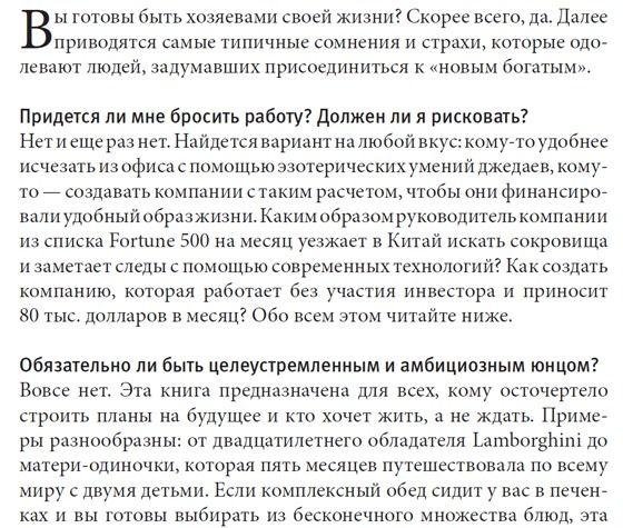Автор рассказывает о секретах «новых богатых» - представителей новой субкультуры, которые отказались от «синдрома отложенной жизни» и научились вести роскошную жизнь «здесь и сейчас», управляя своим временем и большую часть жизни путешествуя по свету.