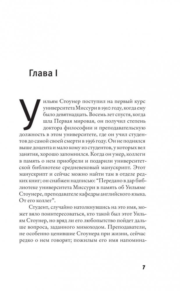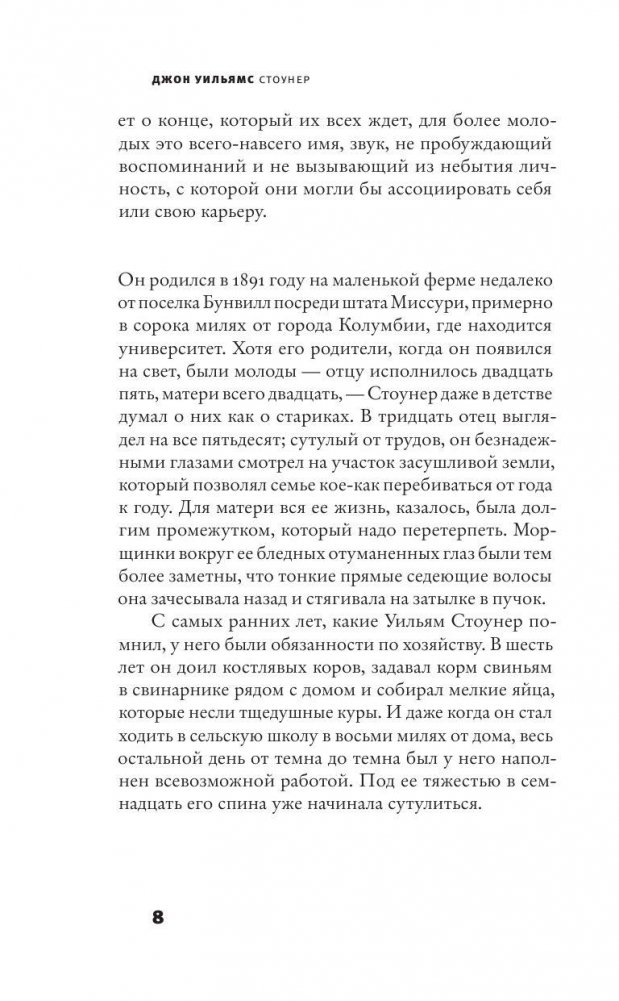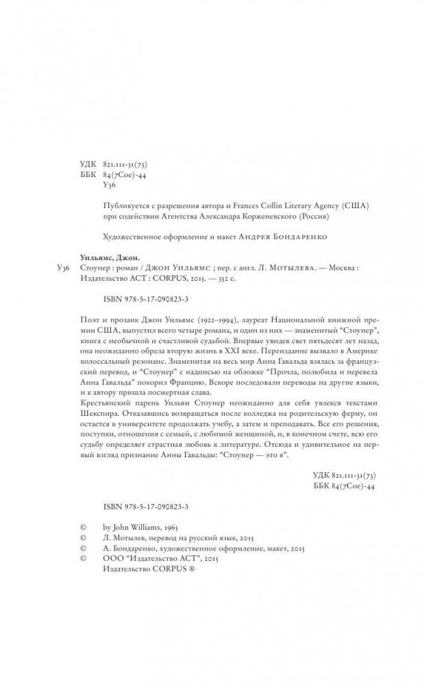 Поэт и прозаик Джон Уильямс (1922–1994), лауреат Национальной книжной премии США, выпустил всего четыре романа, и один из них — знаменитый “Стоунер”, книга с необычной и счастливой судьбой. Впервые увидев свет пятьдесят лет назад, она неожиданно обрела вторую жизнь в XXI веке. Переиздание вызвало в Америке колоссальный резонанс. Знаменитая на весь мир Анна Гавальда взялась за французский перевод, и “Стоунер” с надписью на обложке “Прочла, полюбила и перевела Анна Гавальда” покорил Францию. Вскоре последовали переводы на другие языки, и к автору пришла посмертная слава. Крестьянский парень Уильям Стоунер неожиданно для себя увлекся текстами Шекспира. Отказавшись возвращаться после колледжа на родительскую ферму, он остается в университете продолжать учебу, а затем и преподавать. Все его решения, поступки, отношения с семьей, с любимой женщиной, и, в конечном счете, всю его судьбу определяет страстная любовь к литературе. Отсюда и удивительное на первый взгляд признание Анны Гавальды: “Стоунер — это я”.
