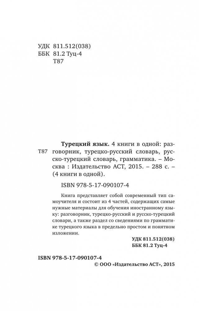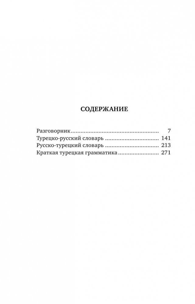 Книга представляет собой современный тип самоучителя и состоит из 4 частей, содержащих самые нужные материалы для обучения иностранному языку: разговорник, турецко-русский и русско-турецкий словари, а также раздел со сведениями по грамматике турецкого языка в предельно простом и понятном изложении.