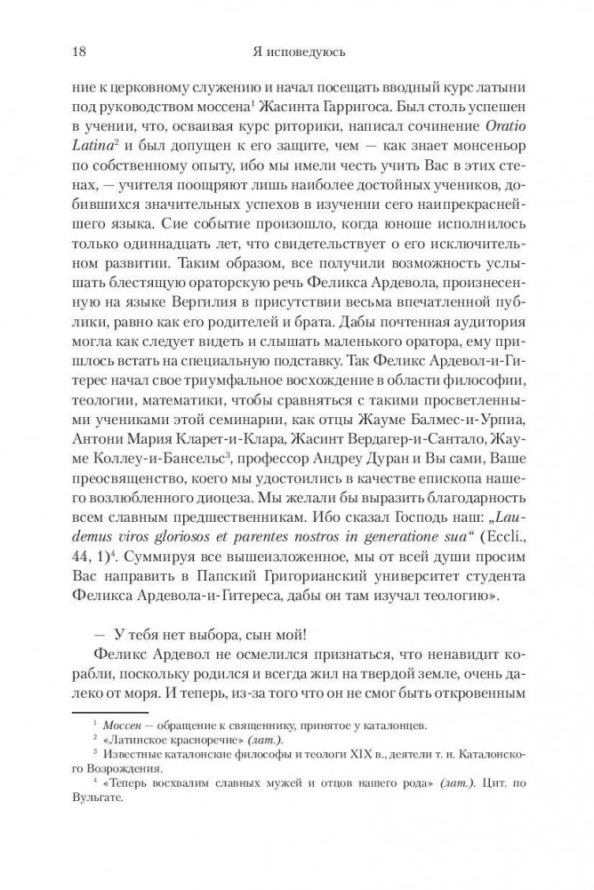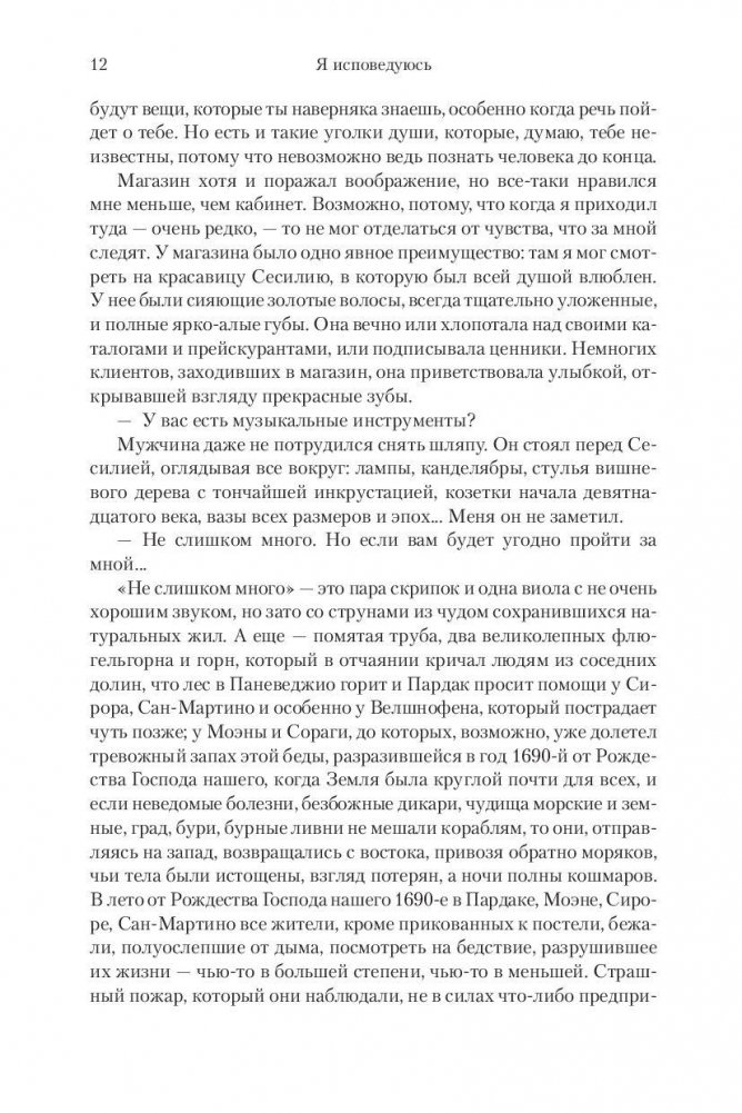 Впервые на русском языке роман выдающегося каталонского писателя Жауме Кабре «Я исповедуюсь». Книга переведена на двенадцать языков, а ее суммарный тираж приближается к полумиллиону экземпляров. Герой романа Адриа Ардевол, музыкант, знаток искусства, полиглот, пересматривает свою жизнь, прежде чем незримая метла одно за другим сметет из его памяти все события. Он вспоминает детство и любовную заботу няни Лолы, холодную и прагматичную мать, эрудита-отца с его загадочной судьбой. Наиболее ценным сокровищем принадлежавшего отцу антикварного магазина была старинная скрипка Сториони, на которой лежала тень давнего преступления. Однако оказывается, что история жизни Адриа несводима к нескольким десятилетиям, все началось много веков назад, в каталонском монастыре Сан-Пере дел Бургал, а звуки фантастически совершенной скрипки, созданной кремонским мастером, магически преображают людские судьбы. В итоге мир героя романа наводняют мрачные тайны и мистические загадки, на решение которых потребуются годы.