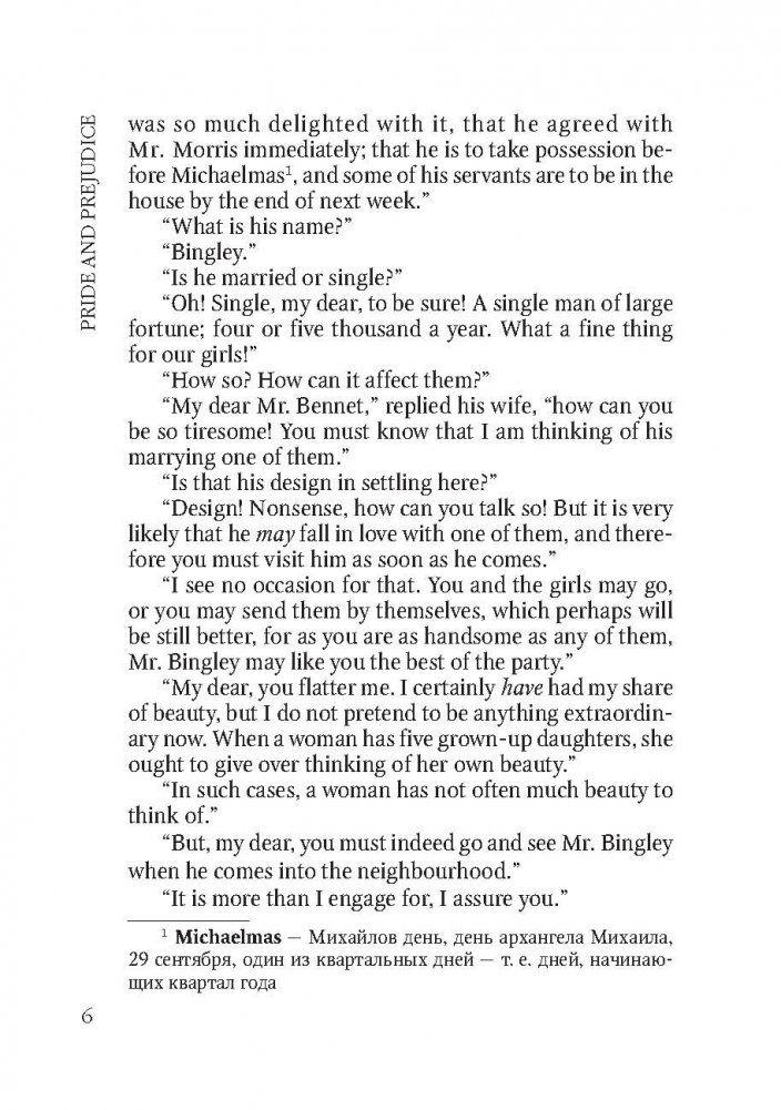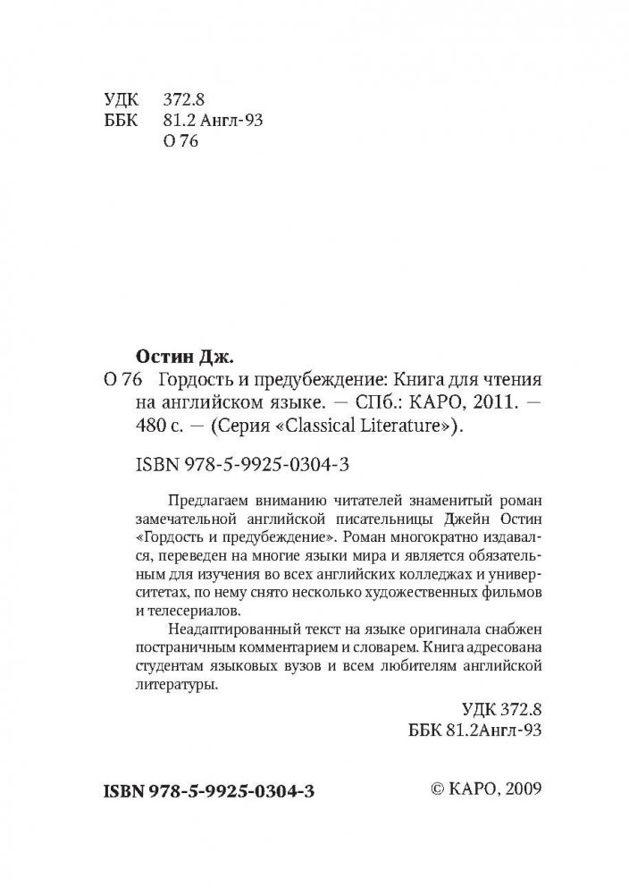 Предлагаем вниманию читателей знаменитый роман замечательной английской писательницы Джейн Остин «Гордость и предубеждение». Роман многократно издавался, переведен на многие языки мира и является обязательным для изучения во всех английских колледжах и университетах, по нему снято несколько художественных фильмов и телесериалов. Неадаптированный текст на языке оригинала снабжен постраничным комментарием и словарем. Книга адресована студентам языковых вузов и всем любителям английской литературы.